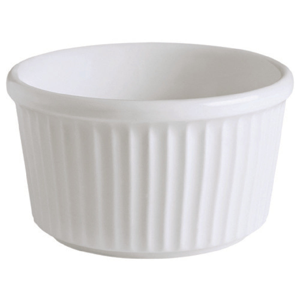 The GET Enterprises PA1101707224 Ramekin 3.4 Oz. 3" Dia. is a versatile and durable item designed to meet the needs of various segments in the food service industry. This small, round ramekin features a 3.4-ounce capacity and a 3-inch diameter, making it ideal for serving sauces, dips, or individual portions of desserts. Its ribbed, rolled edge design not only adds an aesthetic touch but also enhances the strength of the structure. Constructed from porcelain, it promises a bright white finish that complements any dining setting. Its robust design boasts scratch and chip resistance, ensuring longevity in busy environments. Conveniently, this ramekin is microwave, dishwasher, and oven safe up to 380°F, providing flexibility for different preparation and serving methods. As part of the Corona Actualite collection, it is a stocked item available in cases packed by 2 dozen, simplifying inventory management for restaurants, hotels, or catering businesses. The GET Enterprises PA1101707224 Ramekin offers a practical and stylish solution for food presentation, combining functionality with a refined appearance to enhance culinary experiences across various dining establishments.