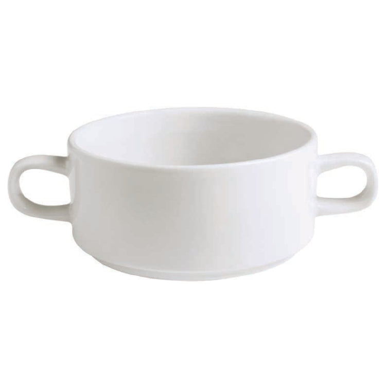 The GET Enterprises PA1101905224 Soup Cup is a durable and versatile dish designed for a variety of food service environments. With a capacity of 11 oz. and a diameter of 4 inches, this cup extends to 6 inches with its practical handles, offering an ergonomic solution for serving hot soups and beverages. Its rolled edge design enhances durability and provides an elegant finish. The cup's stackable nature allows for efficient storage, making it suitable for busy kitchens with limited space. Crafted from high-quality porcelain, it boasts scratch and chip resistance, ensuring longevity in high-traffic settings. It is microwave, dishwasher, and oven safe, enduring temperatures up to 380°F, which enhances its adaptability across different culinary applications. The soup cup's bright white finish from the Corona Actualite series adds a touch of sophistication to any table setting. As a made-to-order item, it requires a lead time of 6 to 8 weeks and a minimum order quantity equivalent to a case, packed by 2 dozen per case. This product is ideal for restaurants, catering services, and hospitality businesses seeking reliable and stylish dishware solutions that meet high standards of performance and presentation.