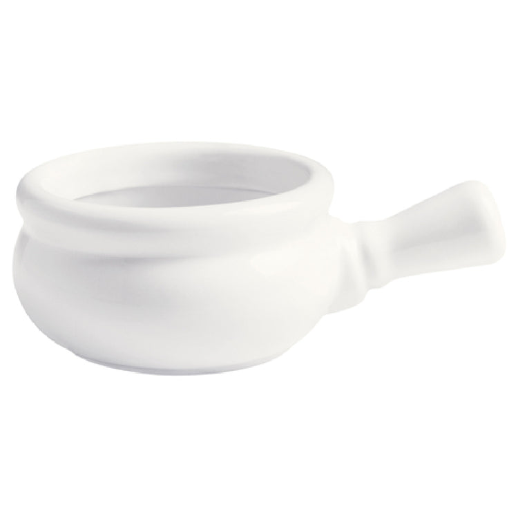 The GET Enterprises PA1101908812 French Onion Soup Bowl is a versatile kitchen essential, distinguished by its 10.7 oz. capacity and 7-inch size. This bowl is meticulously crafted with a rolled edge and a convenient handle, ensuring ease of use while serving. Its construction from durable porcelain guarantees resistance to scratches and chips, making it a reliable choice for both commercial and home kitchens. This bowl is designed to withstand temperatures up to 380°F, making it safe for use in microwaves, dishwashers, and ovens, thereby offering seamless versatility in food preparation and presentation. Available in a bright white hue, it complements various dining settings with its elegant appearance. The product is part of the Corona Actualite line, and it comes packed by the dozen, catering to the needs of restaurants or caterers requiring high-volume usage without compromising on quality or aesthetic appeal. The GET Enterprises PA1101908812 French Onion Soup Bowl is a practical choice for those in the hospitality industry who value durability and style, ensuring it meets the demands of everyday use while enhancing the dining experience with its classic design and functional attributes.