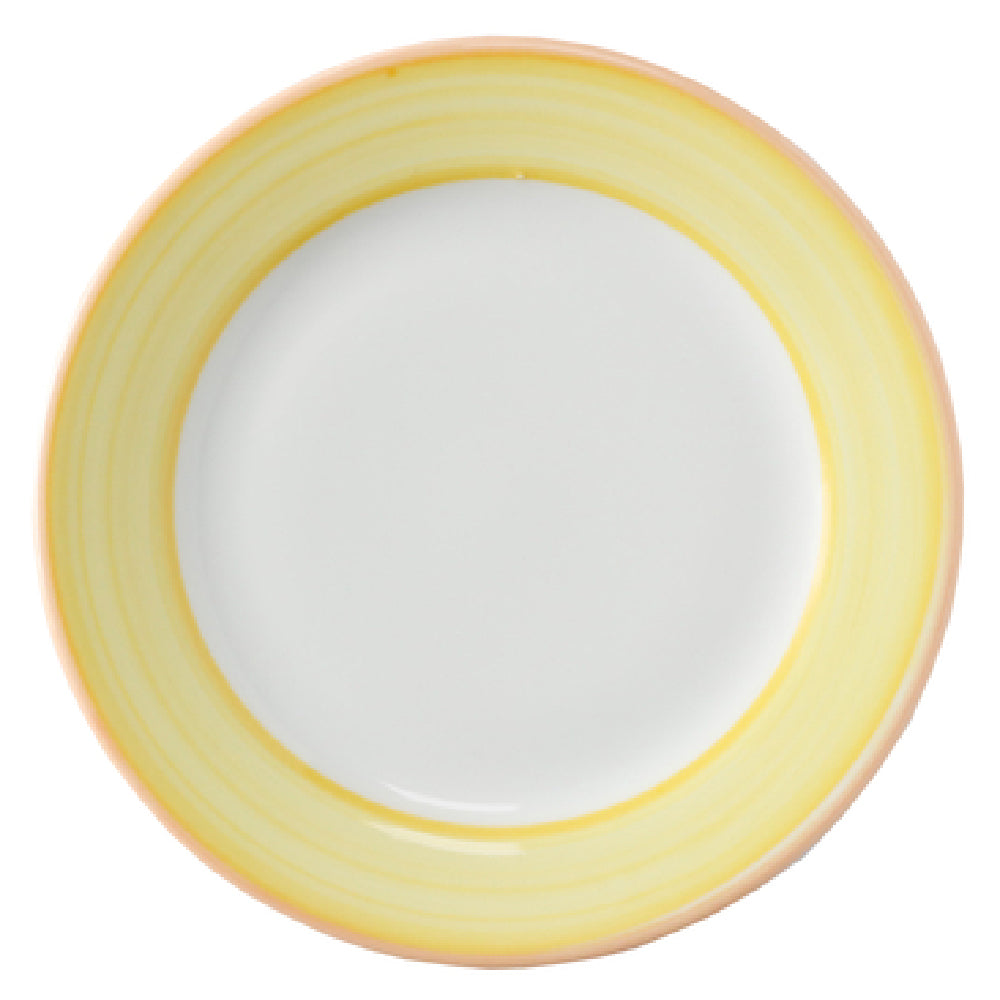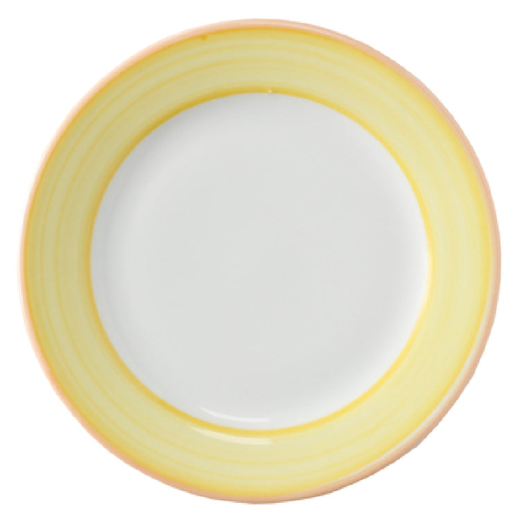 The GET Enterprises PA1600901424 Plate 6-1/2" Dia. Round is a meticulously designed dining solution that caters to various industry needs with its robust features. Measuring 6-1/2 inches in diameter, this round plate embodies both functionality and aesthetic appeal with its sleek rolled edge and striking orange edge that complements its porcelain construction. Its durability is underscored by its scratch and chip-resistant properties, making it an enduring choice for bustling restaurant environments. The plate is engineered to withstand the rigors of microwave, dishwasher, and oven use, with a heat resistance of up to 380°F. Such versatility ensures seamless transitions from food preparation to serving, enhancing operational efficiency in both commercial and residential settings. The plate's distinct design, part of the Corona Calypso Yellow collection, adds a vibrant touch to any dining presentation, appealing to both contemporary and traditional dining aesthetics. Packaged as a stocked item, it is available in cases of 24, making it ideal for bulk purchasing. This product's unique value proposition lies in its combination of durability, heat resistance, and visual appeal, making it a preferred choice for professionals in the food service industry looking for reliable and stylish servingware solutions.