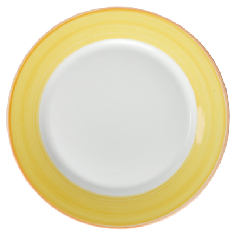 The GET Enterprises PA1600902524 Plate 10" Dia. Round is a meticulously designed dining essential featuring a 10-inch diameter with a distinctive round shape and rolled edge. This plate is crafted from durable porcelain, ensuring its scratch and chip-resistant properties make it a reliable choice for various dining settings. It offers versatility by being microwave, dishwasher, and oven safe up to 380°F, catering to both fast-paced commercial kitchens and home dining convenience. The plate's aesthetic appeal is enhanced by its vibrant orange edge, part of the Corona Calypso Yellow collection, adding a pop of color to any table setting. As a stocked item, it is readily available and is efficiently packed by 2 dozen per case, making it an excellent choice for catering services, restaurants, and large-scale dining events. This plate uniquely balances functionality and style, meeting the diverse needs of different market segments within the foodservice industry and domestic use, appealing to those who prioritize durability without sacrificing visual elegance in their tableware.