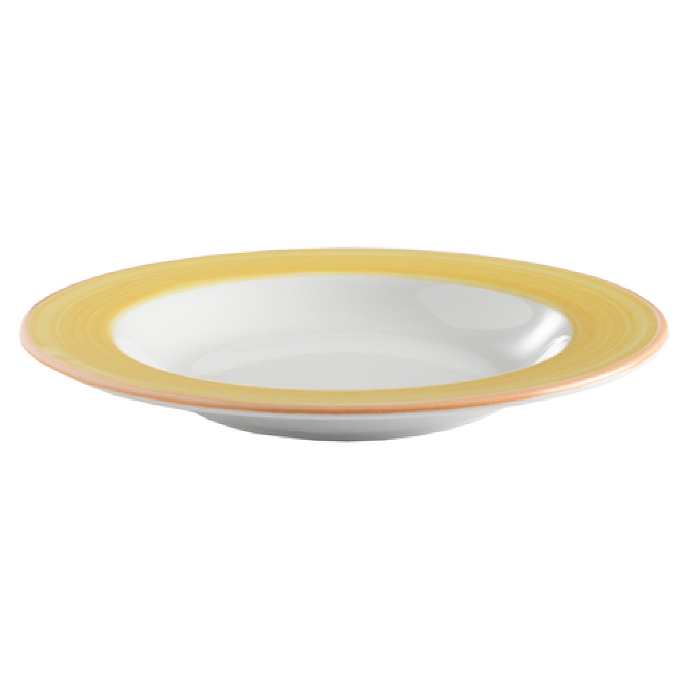 The GET Enterprises PA1600903912 Pasta Bowl is a high-quality dining essential designed for both professional and home use, boasting a capacity of 18-4/5 oz. and a generous 12-inch diameter. This round, rimmed bowl is constructed from durable porcelain, making it a reliable choice for a variety of serving needs. Notably, it is scratch and chip resistant, ensuring longevity and consistent visual appeal even with frequent use. The bowl is microwave, dishwasher, and oven safe up to 380°F, providing flexibility in preparation and serving processes. Its design includes an attractive orange edge, adding a splash of color that can enhance any table setting. Available in Corona, Calypso, and Yellow, this stocked item is packaged by the dozen, catering to the bulk needs of restaurants, catering services, and large-scale hospitality venues. The combination of robust construction, versatile functionality, and appealing aesthetic makes the GET Enterprises PA1600903912 Pasta Bowl an ideal choice for any food service establishment looking to merge practicality with style.