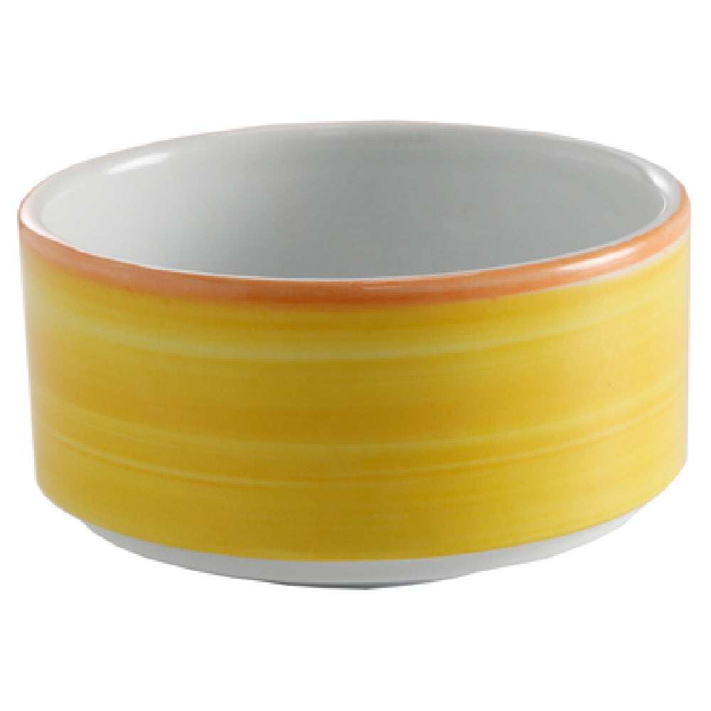 The GET Enterprises PA1600905124 Soup Cup 11 Oz. 4" Dia. is an expertly crafted, versatile dining solution that caters to various segments within the food service industry. Designed with a round shape and measuring 4 inches in diameter, this soup cup holds up to 11 ounces, providing ample capacity for individual servings. The absence of a handle enhances its sleek design while maintaining functionality. This product is stackable, allowing for efficient storage in busy kitchen environments. Constructed from durable porcelain, it is scratch and chip resistant, ensuring longevity and maintaining aesthetic appeal. The soup cup is microwave, dishwasher, and oven safe up to 380°F, making it adaptable to different cooking and cleaning methods. Its distinctive orange edge adds a splash of color, complementing the Corona and Calypso Yellow design. As a stocked item, it is conveniently packaged by 2 dozen per case, streamlining inventory management for businesses. This soup cup's combination of durability, functionality, and style makes it a valuable asset for restaurants, catering services, and hospitality venues seeking reliable and visually appealing serveware.