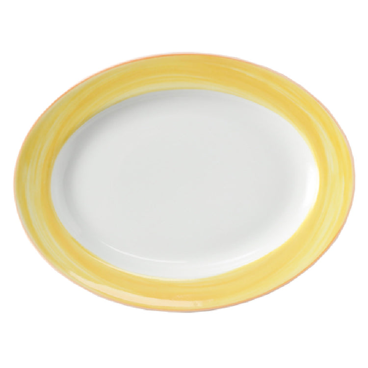 The GET Enterprises PA1600907612 Platter is a versatile and durable dish that measures 10 inches by 7-1/2 inches, crafted in an oval shape. Its rimmed, rolled edge design adds a touch of elegance, while its scratch and chip-resistant properties ensure longevity, making it ideal for heavy-duty use in commercial settings such as restaurants, hotels, and catering services. This platter is microwave, dishwasher, and oven safe, capable of withstanding temperatures up to 380°F, which enhances its utility across various cooking and serving scenarios. Made from quality porcelain, the platter features an attractive orange edge with the distinctive Corona, Calypso, Yellow color scheme, adding vibrant aesthetics to your table settings. Stocked in packs of one dozen, it caters to establishments requiring bulk quantities without compromising on quality or style. The GET Enterprises PA1600907612 Platter stands out in the food service industry for its robust construction and multifunctional applications, making it a valuable asset for businesses aiming to deliver a premium dining experience with reliability and elegance.