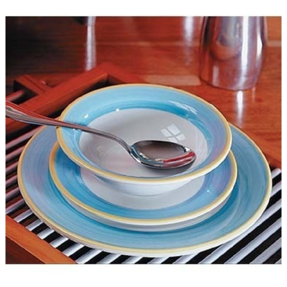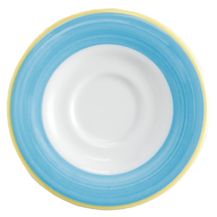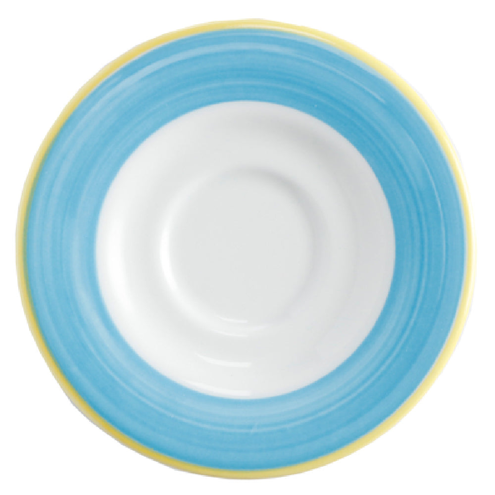 The GET Enterprises PA1601900124 Coffee/Espresso Saucer 5" Dia. Round is a meticulously crafted porcelain saucer that exemplifies durability and functionality, perfect for the hospitality and foodservice industry. With a diameter of 5 inches, this saucer is designed to complement both coffee and espresso cups, making it a versatile addition to any beverage service setting. It is engineered to be scratch and chip resistant, ensuring longevity and maintaining its pristine appearance even under frequent use. The saucer is safe for use in microwaves, dishwashers, and ovens, with a heat tolerance of up to 380°F, which adds convenience and efficiency to operations in busy commercial kitchens. Its aesthetic appeal is enhanced by a distinctive yellow edge, available in the Corona, Calypso, and Blue designs, offering a touch of elegance and style to your tableware collection. As a made-to-order item, it requires a lead time of 12 weeks and a minimum order of 42 dozen, highlighting its exclusivity and customization potential. Each case is packed with 2 dozen saucers, ensuring sufficient supply for large-scale dining establishments. The GET Enterprises PA1601900124 saucer is a reliable and stylish choice for cafes, restaurants, and hotels aiming to deliver a premium coffee or espresso experience.