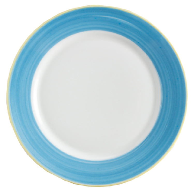 GET Enterprises PA1601902324 Plate 9" Dia. Round is a meticulously crafted dining essential designed to meet the varied needs of the food service industry. With a dimension of 9 inches in diameter, this round plate provides ample space for serving diverse culinary creations. Its rolled edge design not only adds to its aesthetic appeal but also enhances its durability, making it resistant to scratches and chips. This feature ensures longevity even in high-traffic environments such as restaurants and cafeterias. Constructed from premium porcelain, this plate is versatile, being microwave, dishwasher, and oven safe up to 380°F, thus accommodating various heating and cleaning processes seamlessly. The plate's yellow edge, complemented by the Corona and Calypso Blue pattern, offers a vibrant and attractive presentation, perfect for enhancing table settings in both casual and formal dining scenarios. As a stocked item, it comes conveniently packed by 2 dozen per case, making it a practical choice for large-scale operations. GET Enterprises PA1601902324 Plate is an ideal solution for establishments seeking durable and visually appealing tableware that withstands the rigors of daily use while offering an elegant dining experience.
