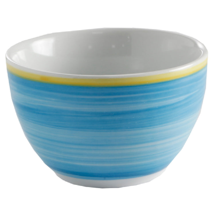 The GET Enterprises PA1601904524 Bouillon Cup 8-4/5 Oz. 4" Dia. is a meticulously designed piece of dinnerware crafted to meet the rigorous demands of the food service industry. This bouillon cup is designed with an 8-4/5-ounce capacity and a diameter of 4 inches, making it an ideal size for serving soups, stews, or broths. Made from durable porcelain, it features a striking yellow edge, adding a touch of elegance to its functional design. The bouillon cup is microwave, dishwasher, and oven safe up to 380°F, ensuring it can withstand the varying temperatures of professional kitchens. Its scratch and chip-resistant properties contribute to its longevity, maintaining a pristine appearance even after extensive use. The product is stocked under the Corona Calypso Blue line and is economically packed by 2 dozen per case, making it a practical choice for restaurants, catering services, and institutional dining facilities. Its combination of durability, safety features, and aesthetic appeal makes the GET Enterprises PA1601904524 Bouillon Cup a versatile and indispensable addition to any culinary establishment seeking reliable and attractive serving solutions.