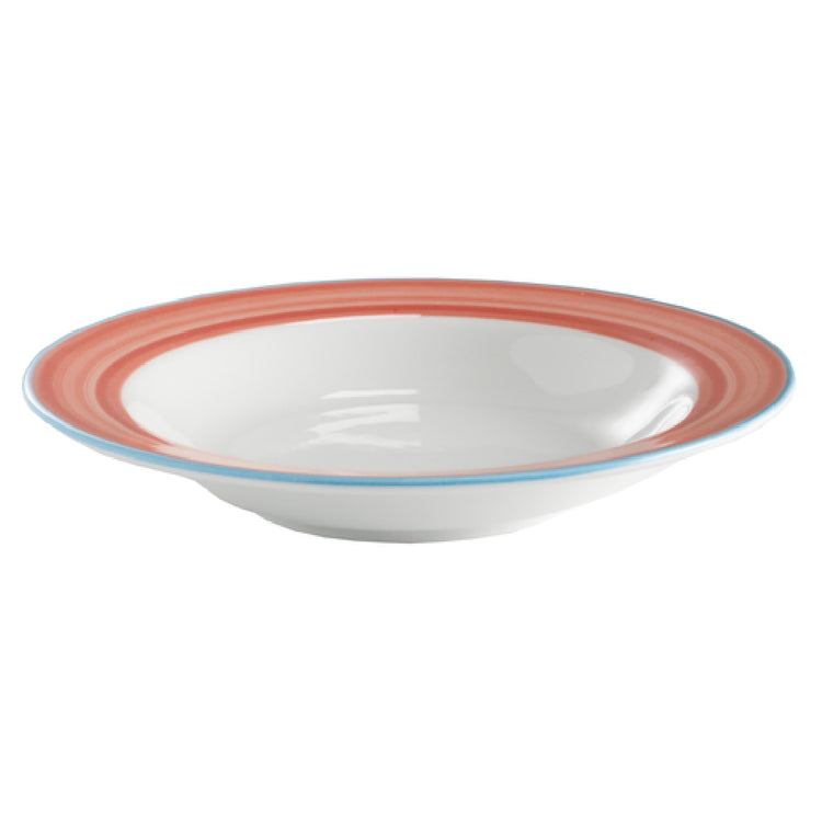 The GET Enterprises PA1602703624 Soup Bowl is a meticulously designed culinary essential, featuring a 9-7/10 oz. capacity and a 9" diameter, tailored for a variety of dining settings. This round, rimmed bowl is constructed from durable porcelain, ensuring longevity through its scratch and chip-resistant properties. Its design, enhanced by a distinctive blue edge, adds an elegant touch to any table setting. The bowl is versatile, being microwave, dishwasher, and oven safe, withstanding temperatures up to 380°F, which makes it a practical choice for both preparation and presentation of soups and other hot dishes. This product is available in a distinctive Corona, Calypso, and Coral color scheme, catering to diverse aesthetic preferences and enhancing visual appeal. Sold in cases of two dozen, it meets the demands of high-volume commercial environments, making it a reliable choice for restaurants, catering services, and hospitality venues seeking durable and stylish serving solutions. The GET Enterprises PA1602703624 Soup Bowl stands out for its combination of functionality, durability, and aesthetic appeal, providing a unique value proposition for businesses that prioritize both efficiency and elegant presentation in their service offerings.