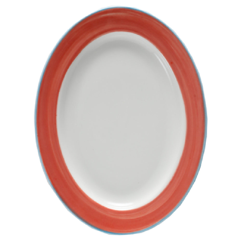 The GET Enterprises PA1602907712 Platter 12" X 9" Oval is a meticulously crafted serving piece, ideal for various dining environments such as restaurants, catering services, or home gatherings. This platter features a generous 12-inch by 9-inch oval shape, providing ample space for serving an array of culinary delights. Designed with a rimmed, rolled edge, it enhances both aesthetic appeal and functionality. The platter is constructed from high-quality porcelain, ensuring durability and resistance to scratches and chips, making it a reliable choice for frequent use. It includes a blue edge, adding a touch of elegance to its design. Notably versatile, the platter is microwave, dishwasher, and oven safe, withstanding temperatures up to 380°F, which offers flexibility in food preparation and serving. Part of the Corona, Calypso, and Coral collections, this platter is a stocked item available in a pack of one dozen, making it an excellent option for establishments requiring consistency and high-volume use. Each feature of the GET Enterprises PA1602907712 is carefully considered to provide users with a product that seamlessly combines durability, style, and practicality, catering to various market needs within the food service industry.