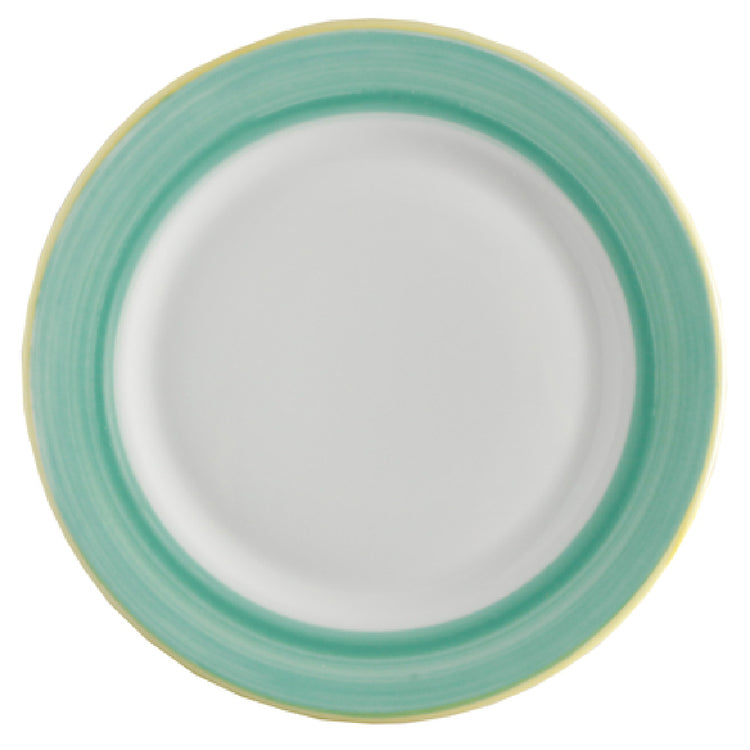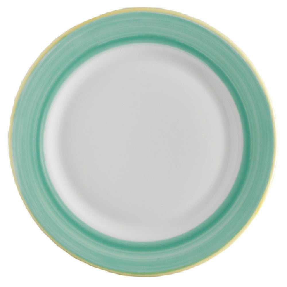 The GET Enterprises PA1603902324 Plate 9" Dia. Round is a versatile and durable dining solution designed for a range of food service environments. With a diameter of 9 inches, this round plate features a rolled edge that enhances its aesthetic appeal while providing additional strength. Constructed from porcelain, the plate is scratch and chip-resistant, ensuring longevity even in high-traffic settings. It is microwave and dishwasher safe, adding convenience for both food preparation and cleaning processes, and it can withstand oven temperatures up to 380°F, making it suitable for a variety of cooking and serving needs. The plate's design is accented with a yellow edge, contributing a touch of color to any table setting and aligning with the Corona Calypso Green theme. As a stocked item, it is available in bulk, packed by 2 dozen per case, which is ideal for restaurants, catering services, and hospitality establishments seeking reliable and stylish dinnerware. This blend of durability, safety, and aesthetic appeal makes the GET Enterprises PA1603902324 Plate an excellent choice for different segments within the food service industry, from casual dining to more upscale environments, providing both functionality and a distinctive visual element to dining presentations.