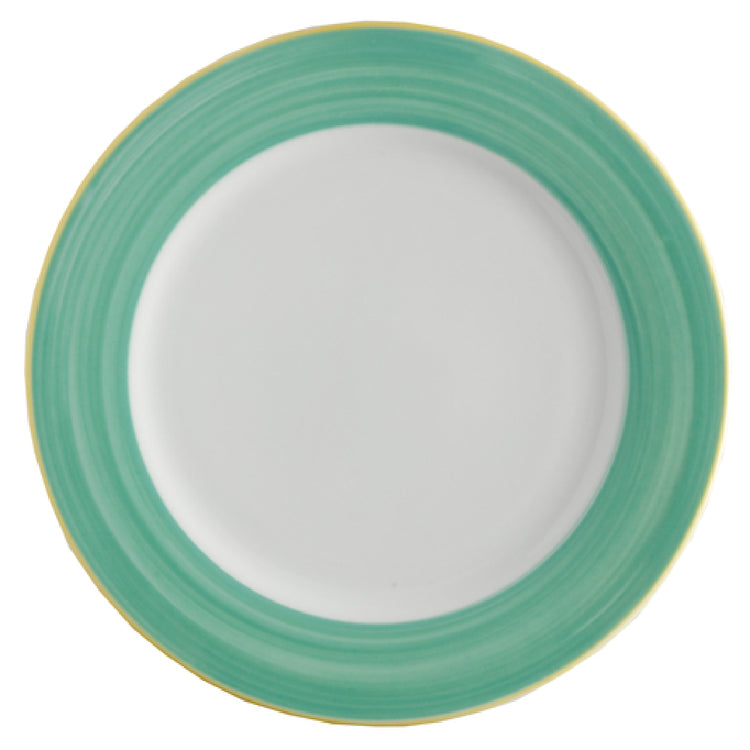 The GET Enterprises PA1603902912 Plate 12-1/4" Dia. Round is a meticulously crafted porcelain plate designed to meet the high standards of professional kitchens and dining establishments. This plate features a 12-1/4-inch diameter, providing ample space for a variety of culinary presentations. Its round shape, complemented by a rolled edge, enhances durability and resistance to scratches and chips, ensuring longevity in demanding environments. The plate is microwave, dishwasher, and oven safe, withstanding temperatures up to 380°F, making it an ideal choice for versatile cooking and serving applications. Its aesthetic appeal is highlighted by a distinctive yellow edge, part of the Corona Calypso Green collection, offering a vibrant touch to any table setting. As a stocked item, this plate is packaged by the dozen, ensuring efficient inventory management for restaurants and catering services. The GET Enterprises PA1603902912 Plate seamlessly combines functionality with style, making it a valuable addition to any dining experience, whether in a bustling restaurant or a sophisticated event setting.