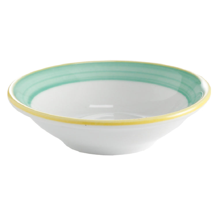The GET Enterprises PA1603903224 Bowl 15-1/2 Oz. 7" Dia. is a versatile and durable piece of tableware designed to meet the diverse needs of foodservice establishments. With a capacity of 15-1/2 ounces and a diameter of 7 inches, this round bowl is perfect for serving a variety of dishes, from soups to salads. Its construction from scratch and chip-resistant porcelain ensures longevity and maintains a pristine appearance even with frequent use. The bowl features a distinctive yellow edge, adding a touch of elegance and vibrancy to its aesthetic, while the Corona and Calypso Green color options provide further customization to suit different themes and settings. Designed for practicality, this bowl is microwave, dishwasher, and oven safe up to 380°F, making it suitable for various kitchen operations and heat-related tasks. The GET Enterprises PA1603903224 Bowl is stocked as a standard item and is packaged in cases of 2 dozen, catering to the needs of high-volume environments like restaurants, hotels, and catering services. Its combination of durability, style, and functional versatility makes it a valuable addition to both professional and casual dining settings, ensuring consistent performance and visual appeal.