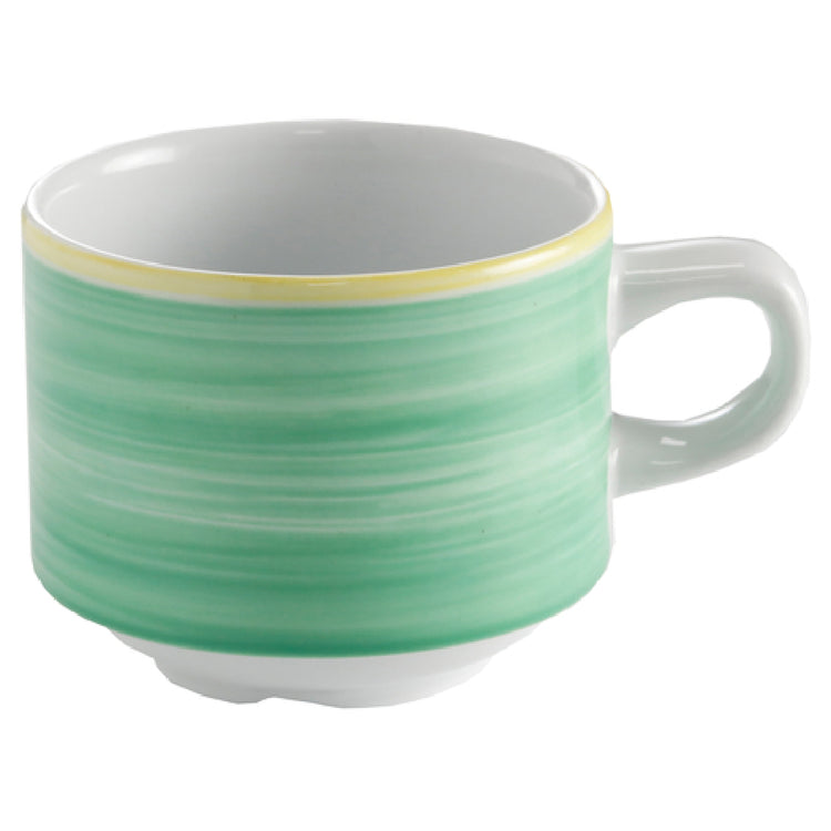 The GET Enterprises PA1603904324 Tea Cup 8-1/10 Oz. 4-1/2" Dia. is meticulously crafted to meet the demands of diverse markets within the food and beverage industry. With a capacity of 8-1/10 ounces and a diameter of 4-1/2 inches, this tea cup is engineered for efficiency and style. It includes a handle for easy use and is designed to be stackable, optimizing space in professional settings. Its construction boasts a scratch and chip-resistant porcelain, ensuring long-lasting durability. The tea cup's safety features extend to being microwave, dishwasher, and oven safe, withstanding temperatures up to 380 degrees Fahrenheit. The unique yellow edge, available in the Corona Calypso Green design, adds an aesthetic value that appeals to both contemporary and traditional dining environments. Packed by 2 dozen per case, it is a stocked item ensuring consistent availability. This tea cup is a versatile choice for restaurants, cafes, and catering businesses, combining functionality with a distinctive design, making it an asset for any food service operation looking to enhance its dining presentation.