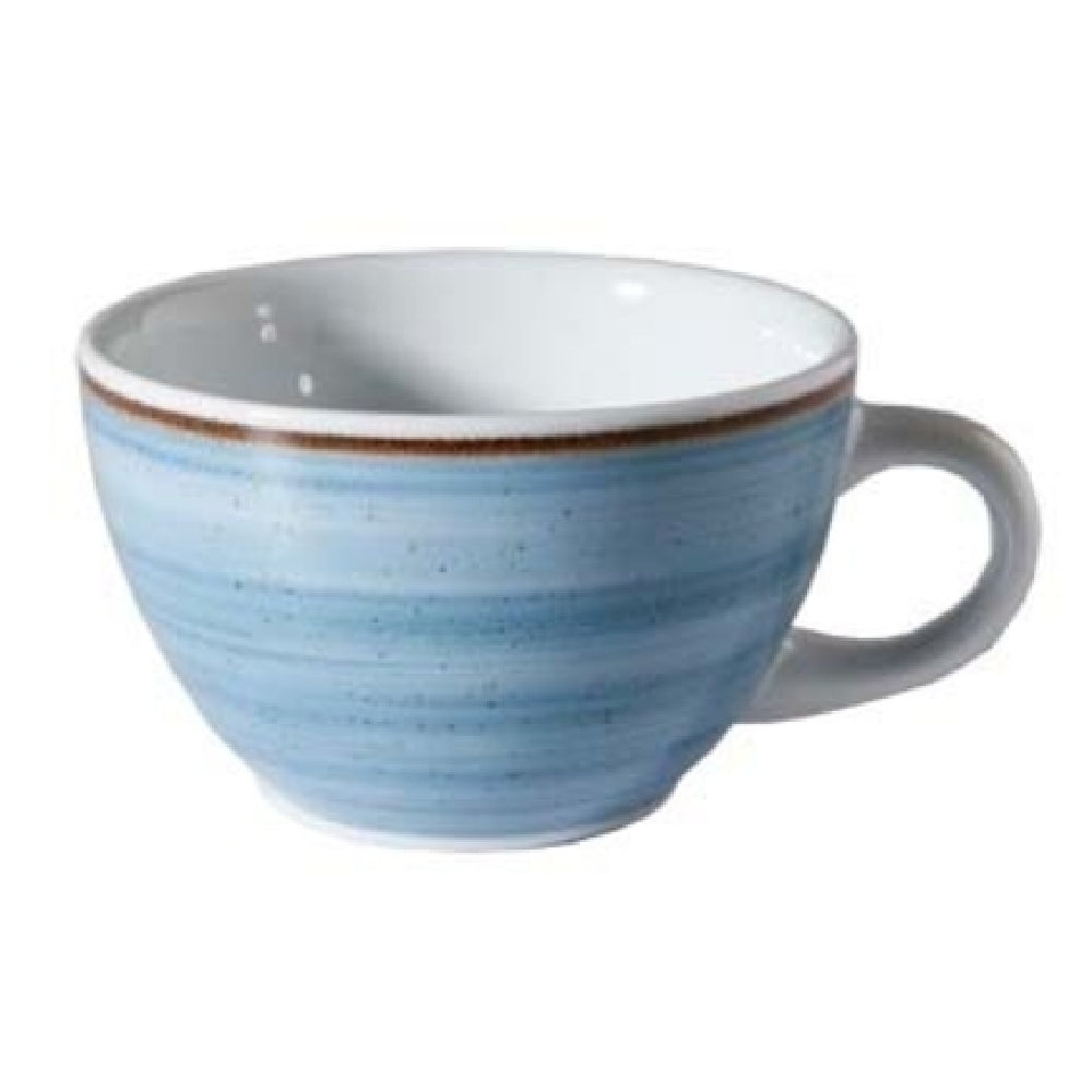 GET Enterprises PA1604904424 Tea Cup 8.8 Oz. 5" is a meticulously crafted porcelain tea cup designed for both durability and elegance in various dining settings. Its 8.8-ounce capacity is well-suited for serving hot beverages, catering to the preferences of tea enthusiasts and professionals alike. The cup's 5-inch size, complete with a convenient handle, combines practicality with a classic aesthetic, making it a versatile choice for restaurants, cafes, and hospitality venues. This tea cup features a rolled edge, enhancing its scratch and chip resistance, thereby ensuring longevity even in high-traffic environments. It is equipped to withstand the rigors of microwave, dishwasher, and oven use, with a safety threshold up to 380°F, offering flexibility in food service operations. The porcelain material, in a delicate Corona Artisan blue, adds a touch of sophistication to any table setting. As a made-to-order item, it requires a lead time of 6 to 8 weeks, with a minimum order quantity reflecting its exclusivity. Packaged by 2 dozen per case, this tea cup is a reliable and stylish addition to any establishment prioritizing quality and durability in their serveware collections.