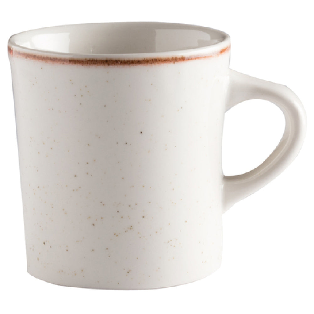The GET Enterprises PP1605726424 Mug 11 Oz. 5" stands out as a versatile choice for both commercial and residential settings, combining practicality with elegance. With its 11 oz. capacity, this mug is ideal for serving a variety of hot beverages. It features a 5-inch height and a comfortable handle, ensuring ease of use in busy environments. The mug's rolled edge design enhances its durability, making it scratch and chip resistant, which is crucial for high-traffic establishments. Constructed from high-quality porcelain, the mug is a part of the Corona Artisan collection and comes in a sophisticated beige finish. This product is microwave, dishwasher, and oven safe up to 380°F, adding to its convenience and functionality for different market segments, particularly in hospitality and food service industries. The GET Enterprises PP1605726424 Mug's robust build and elegant appearance make it a stocked item, available in cases packed by 2 dozen, accommodating the needs of cafes, restaurants, and catering businesses seeking reliable and aesthetically pleasing drinkware.