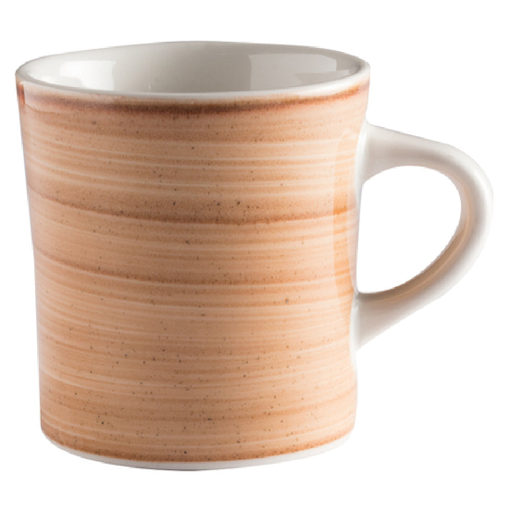 The GET Enterprises PP1606726424 Mug is a meticulously designed porcelain mug, offering a generous 11 oz. capacity and measuring 5 inches in height. This versatile mug is equipped with a convenient handle and a rolled edge that enhances its durability and aesthetic. Engineered for resilience, it is scratch and chip resistant, making it an ideal choice for both commercial and home use. The mug's compatibility with microwaves, dishwashers, and ovens up to 380°F ensures it meets a variety of culinary needs, from reheating beverages to serving hot drinks directly from the oven. Its stylish brown color and the distinctive Corona Artisan design add a touch of elegance to any setting, making it suitable for upscale dining environments or casual coffee shops alike. Packed by the dozen, it is a stocked item, ready to meet the demands of high-traffic environments. The GET Enterprises PP1606726424 Mug seamlessly combines functionality and style, making it a valuable addition to any foodservice operation seeking durable and attractive drinkware. Ideal for different segments within the hospitality industry, this mug is designed to withstand the rigors of daily use while maintaining its pristine appearance, thus offering a reliable solution for establishments focused on quality and presentation.