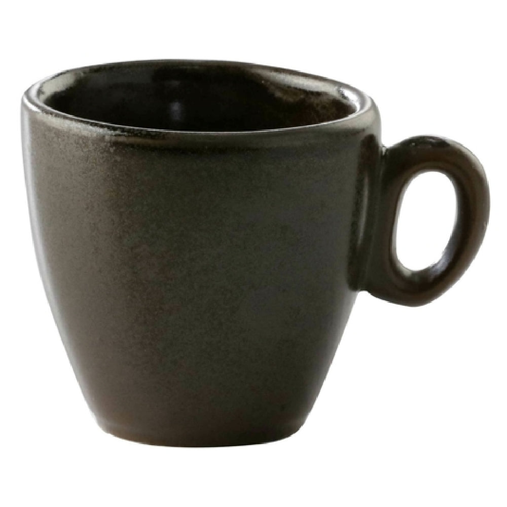 GET Enterprises PP1942814124 Espresso Cup - This elegantly designed espresso cup holds 1-7/8 ounces and measures 3 inches in diameter, boasting a convenient handle for effortless handling. Crafted from high-quality porcelain, it features a rolled edge and a durable construction that is both scratch and chip resistant, ensuring longevity in various settings. This cup is microwave, dishwasher, and oven safe up to 380°F, making it versatile for use in different environments, from home kitchens to professional cafes. The dark brown reactive glaze, in the Corona, Cosmos Mercury pattern, provides a sophisticated aesthetic, adding a touch of elegance to any table setting. As a made-to-order item, the lead time is 6 to 8 weeks, with a minimum order requirement of a case quantity, which is packed as 2 dozen per case. This espresso cup is ideal for restaurants, hotels, and catering services looking for reliable and stylish drinkware that withstands the demands of frequent use while maintaining its refined appearance.