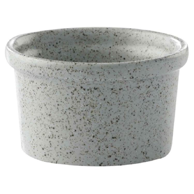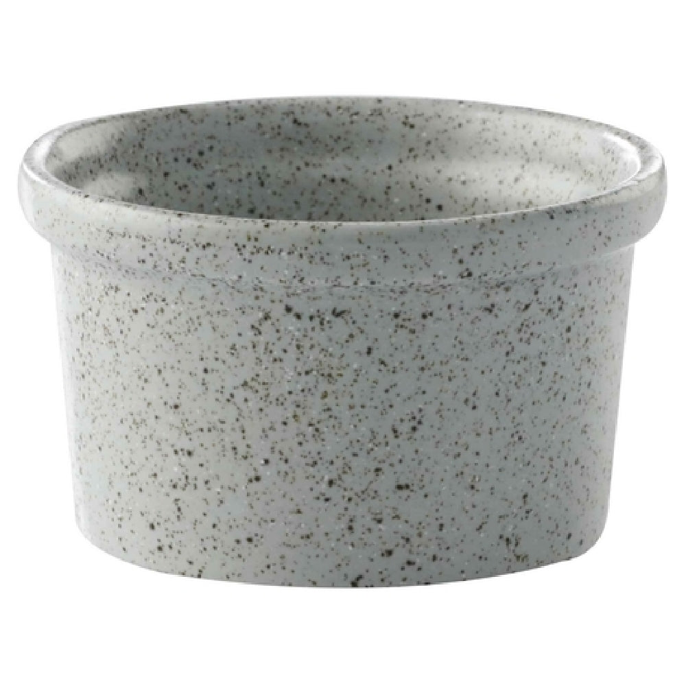 The GET Enterprises PP1944807324 Ramekin is a versatile dining essential, boasting a capacity of 6.4 oz. and a diameter of 3-2/3 inches, making it suitable for various culinary applications. This small, round ramekin features a rolled edge design, enhancing its aesthetic appeal while providing practicality in handling and serving. Notably, the ramekin is crafted from porcelain, ensuring durability and a premium finish. It is designed to be scratch and chip-resistant, offering longevity in high-traffic environments such as restaurants or catering services. The speckled grey reactive glaze in the Corona, Cosmos Moon pattern adds a sophisticated touch to any table setting. This ramekin is highly functional, being microwave, dishwasher, and oven safe up to 380°F, making it a convenient option for both preparation and presentation. As a made-to-order item, it requires a lead time of 6 to 8 weeks, with a minimum order quantity per case. This product is packed by two dozen per case, catering efficiently to bulk purchase requirements for establishments needing uniform and reliable serving ware.
