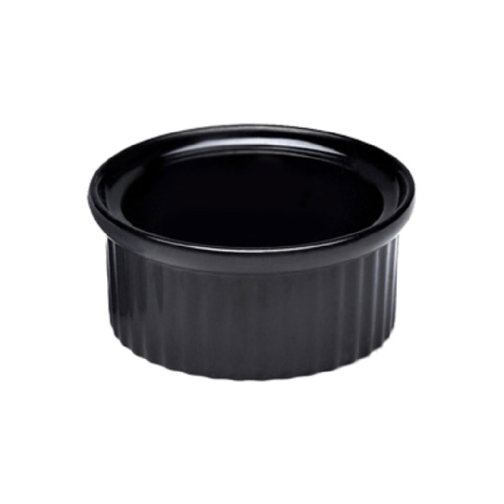 The GET Enterprises R1-B Elite Global Solutions Ramekin 1 Oz. 2-1/8" Dia. X 1"H is an expertly crafted serving piece designed for a variety of culinary applications. This round ramekin measures 2-1/8 inches in diameter and 1 inch in height, offering a precise 1-ounce capacity ideal for sauces, condiments, and small portions. Engineered from durable black melamine, this ramekin is ribbed for an added touch of elegance while ensuring break, chip, stain, and scratch resistance, making it a resilient choice for high-traffic food service environments. Its BPA-free construction guarantees food safety, aligning with modern health standards. Additionally, the product's dishwasher-safe nature facilitates ease of maintenance, allowing for quick and efficient cleaning cycles. Whether employed in upscale dining establishments, catering services, or casual eateries, the GET Enterprises R1-B Elite Global Solutions Ramekin combines robustness with aesthetic appeal, catering to diverse market segments seeking reliable and stylish serving solutions. Packed by 6 each per case, it is well-suited for both small-scale operations and larger culinary enterprises looking to enhance their presentation with durable, high-quality ramekins.