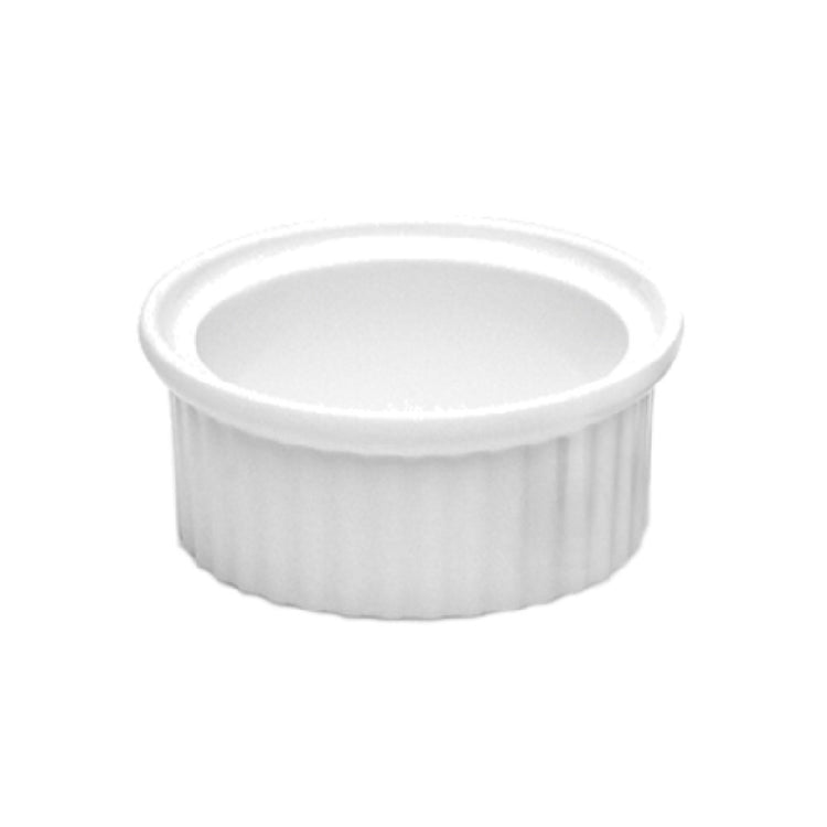 The GET Enterprises R4-W Elite Global Solutions Ramekin 4 Oz. 3-1/4" Dia. X 1-5/8"H is an exceptional piece of kitchenware designed to add both functionality and elegance to your dining experience. This round, ribbed ramekin is crafted from high-quality melamine, providing a stylish white finish that seamlessly fits into various dining settings. Its dimensions-3-1/4" diameter and 1-5/8" height-allow for a convenient 4-ounce capacity, making it perfect for serving individual portions of sauces, condiments, or desserts. The ramekin is engineered to resist breaking, chipping, staining, and scratching, ensuring long-lasting durability even with frequent use. It is dishwasher safe, allowing for easy cleaning and maintenance, and is completely BPA free, ensuring safety for all users. These features make the R4-W ramekin a must-have for restaurants, catering services, and home kitchens that prioritize both quality and aesthetic appeal. Packed in cases of six, it is ideal for establishments looking to efficiently manage their tableware inventory while maintaining a high standard of service. Whether for professional or personal use, this ramekin combines utility, resilience, and style, serving as a versatile addition to any culinary setting.