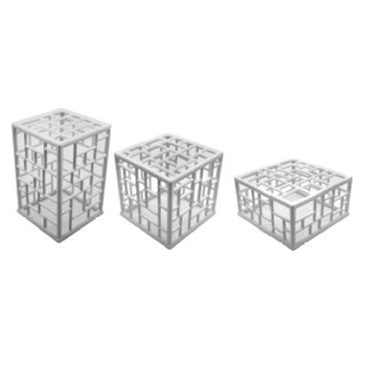 The GET Enterprises SCUB3-WW Bugambilia® Mondrian Riser Set 3 Piece is a versatile solution for enhancing display presentations, ideal for the catering and hospitality industries. This set includes three risers with dimensions of 10" x 10" x 14-1/2"H, 11" x 11" x 10-3/4"H, and 13" x 13" x 6-3/4"H, making it suitable for various display configurations. Each riser is crafted from durable cast aluminum with a resin coating, ensuring a long-lasting performance with a classic finish. The solid white color provides a clean and modern aesthetic that complements any decor style. The Mondrian design not only adds an artistic touch but also offers practical solutions for optimizing space on buffet tables or display shelves. With a lead time of 30 days, this riser set is meticulously packed by one set, ensuring safe delivery and handling. These features make the Bugambilia® Mondrian Riser Set an essential tool for businesses seeking to enhance their food presentations with a stylish and functional approach.