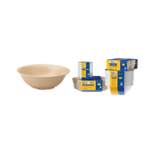 The GET Enterprises SP-M-810-T Supermel™ Bowl is a versatile dining solution, crafted for both durability and convenience in various food service settings. This bowl features a 16 oz. capacity, with the ability to reach 24 oz. when filled to the rim, providing ample space for a variety of serving needs. Measuring 6-1/2 inches in diameter and standing at 2-1/4 inches tall, its compact size makes it ideal for efficient storage and handling. Constructed from break-resistant melamine, the bowl is designed to withstand the rigors of high-volume use, maintaining its quality over time. Its tan color adds a subtle elegance, blending seamlessly with a range of tableware. The bowl is also dishwasher safe, ensuring easy cleaning and maintenance, which is crucial for maintaining hygiene standards in food service environments. Additionally, the product meets NSF certification requirements, confirming its adherence to strict public health and safety guidelines. Packed by the dozen, the GET Enterprises SP-M-810-T Supermel™ Bowl is a practical choice for restaurants, catering services, and institutional dining facilities seeking reliable and attractive tableware options. Its thoughtful design and robust construction make it a valuable addition to any professional kitchen or dining service operation.