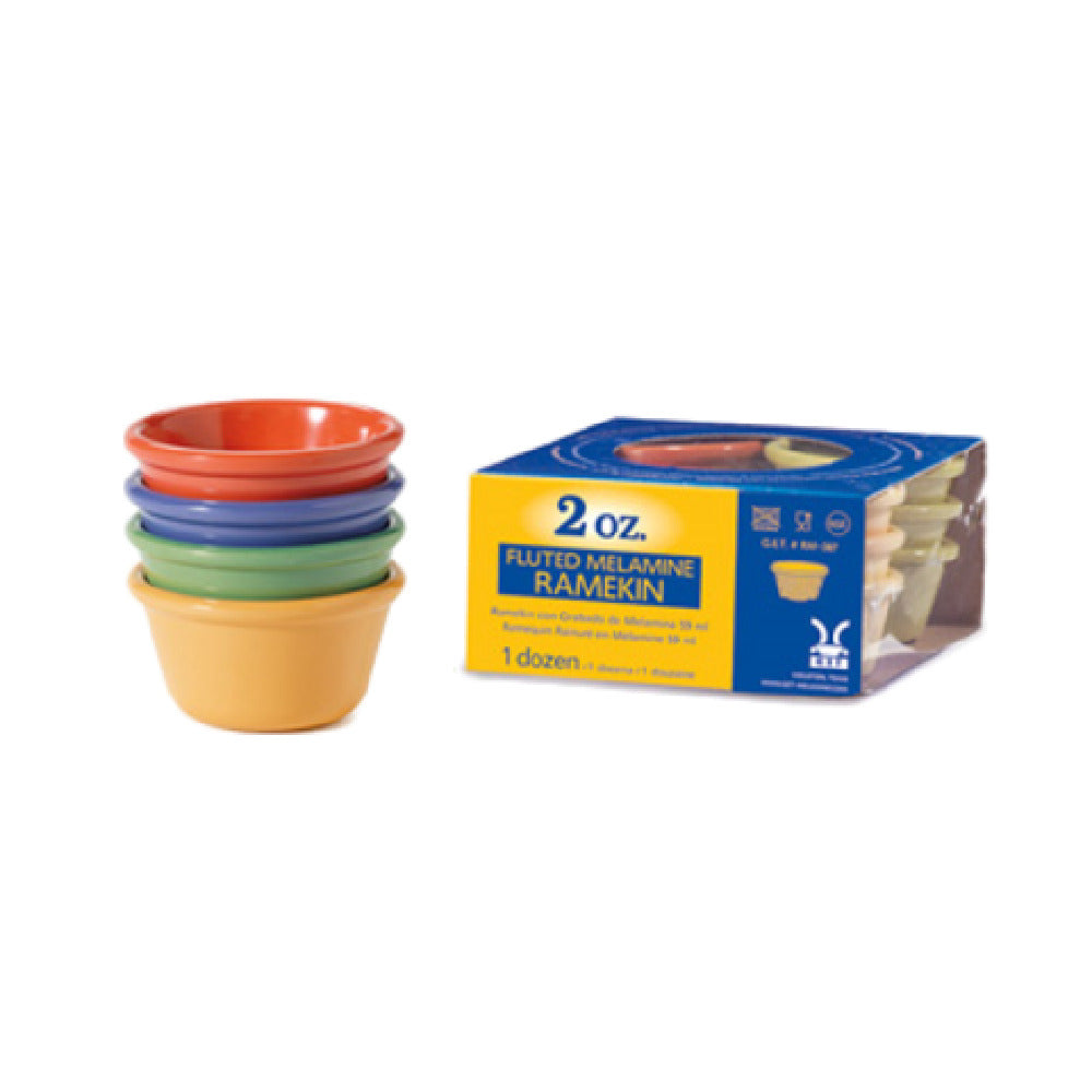 The GET Enterprises SP-RM-400-MIX Diamond Mardi Gras™ Ramekin 4 Oz. 3-1/4" Dia. X 1-3/4"H is a versatile serving solution designed for both commercial and home settings, featuring a 4 oz. capacity ideal for condiments, sauces, and small portions. This ramekin is crafted from durable melamine, ensuring a lightweight yet robust construction suitable for frequent use. The product comes in a mix pack of four vibrant Mardi Gras™ colors: tropical yellow, rio orange, peacock blue, and rainforest green, providing an eye-catching presentation that can enhance any dining setting. Each ramekin measures 3-1/4 inches in diameter and 1-3/4 inches in height, offering a compact size that fits seamlessly into different table arrangements. It is NSF certified, signifying adherence to strict public health and safety standards, making it a reliable choice for professional food service establishments. Special packaging ensures that each case is packed by 4 dozen, facilitating easy storage and inventory management. The GET Enterprises SP-RM-400-MIX ramekin's blend of functionality, aesthetic appeal, and compliance with industry standards makes it a practical addition for restaurants, catering services, and at-home dining experiences, where quality and presentation are paramount.
