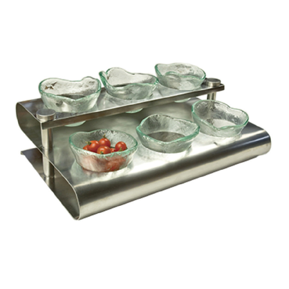 The GET Enterprises SSCOND-01 Condiment Rack is a versatile and practical addition to any food service environment, offering a sleek S-shaped design that measures 15-1/4" x 10" x 4-1/2"H. Constructed from durable stainless steel, this condiment rack is designed to withstand the demands of busy commercial kitchens or catering services. It features six compartments, providing ample space for organizing condiments or other essentials, and it is compatible with the 4-89444 model. The robust stainless steel construction ensures long-lasting durability and easy maintenance, making it an ideal choice for restaurants, cafeterias, and buffet settings. This condiment rack is packed individually, ensuring that it arrives in pristine condition ready for immediate use. Its functional design and optimal size make it suitable for a variety of uses, enhancing the efficiency and organization of condiment stations across different market segments within the food service industry. Whether used in a bustling restaurant or a catering event, the GET Enterprises SSCOND-01 Condiment Rack combines functionality with a modern aesthetic, providing a professional solution for condiment organization.