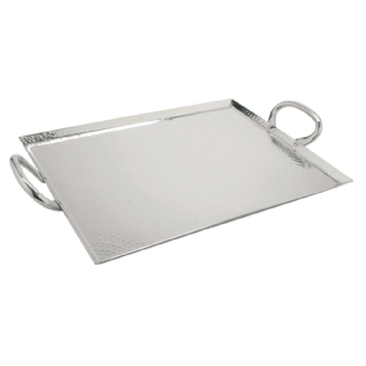 The GET Enterprises SSTPD-1612-MP Urban Renewal™ Hammersmyth Tray 12" X 16" X 3/8" Rectangular is a meticulously designed serving solution catering to various segments within the foodservice industry. This tray measures 12 inches by 16 inches with a thickness of 3/8 inches, offering ample space for presenting an array of culinary delights. Crafted from stainless steel, it guarantees durability and a long service life, making it a reliable choice for high-volume environments such as restaurants, catering services, and hospitality venues. The tray features a hammered finish that adds a touch of elegance, while the mirror polish enhances its visual appeal, making it suitable for upscale dining presentations. Equipped with two handles, this tray ensures ease of transport and handling, a crucial feature for busy kitchen and serving staff. The combination of functional design and aesthetic appeal positions the Hammersmyth Tray as a versatile asset, capable of elevating food presentation while meeting the practical demands of professional kitchens. Its robust construction and sophisticated finish make it an ideal choice for establishments aiming to enhance their service with a touch of modern elegance.