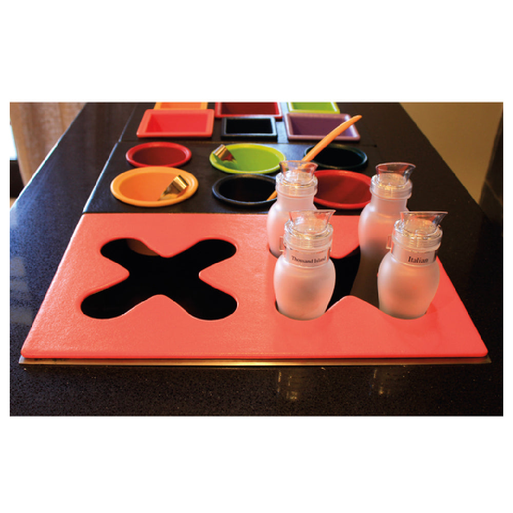 The GET Enterprises T0BSDBWW Bugambilia® Single Tile 21-11/16" X 13-1/4" with (2) "X" Shaped Cutouts is an intricately designed component that blends practicality with aesthetic appeal. This single tile is precisely sized at 21-11/16 inches by 13-1/4 inches, making it a versatile option for various display and serving needs in the food service industry. Its unique design includes two "X" shaped cutouts, which are tailored to fit up to eight GET SDB-16-PC-B or eight GET SDB-32-PC-B serving dishes, offering a custom fit for efficient service and organization. The tile is constructed from cast aluminum, known for its strength and durability, and is coated with a resin finish that enhances its longevity and appearance. The solid white color of the tile provides a clean and sophisticated look, suitable for upscale dining environments as well as casual eateries. While this product is noted to be discontinued, interested customers are encouraged to contact for availability. Packaged individually, this Bugambilia® tile is a noteworthy addition for catering professionals and restaurateurs seeking premium, functional, and stylish service solutions.