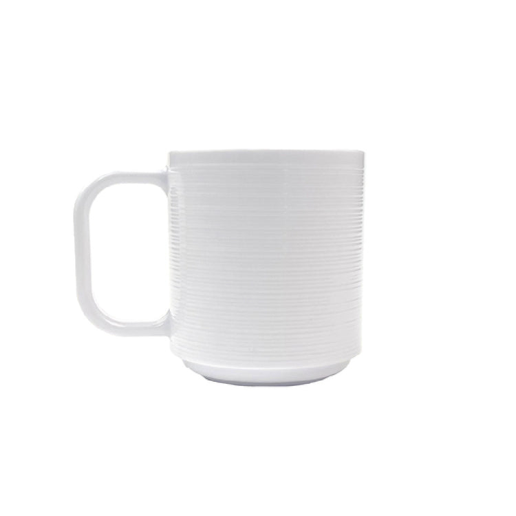 The GET Enterprises TM-12-MN-W Minski™ Coffee Mug - 13 Oz. (15.5 Oz. Rim-full) combines elegant design with practical functionality, making it a versatile choice for various market segments. This coffee mug has a diameter of 3-1/2 inches and a height of 3-7/10 inches, with an overall width of 4-4/5 inches including the handle, providing ample space for comfortable gripping. Its textured surface adds both aesthetic appeal and tactile interest. The mug is constructed from TRITAN, known for its durability and resilience, which makes it an ideal choice for high-traffic environments such as cafeterias, restaurants, and corporate offices. Designed with stackability in mind, it optimizes storage space, which is particularly beneficial for establishments with limited storage capacity. The classic white color of the mug allows it to fit seamlessly into various settings, from casual to formal. Packed by two dozen per case, this product caters to bulk purchasing needs while ensuring consistent quality. The GET Enterprises TM-12-MN-W Minski™ Coffee Mug is not just a vessel for beverages; it is a robust, reliable, and stylish addition to any beverage service, supporting both functionality and aesthetic requirements within the hospitality industry.