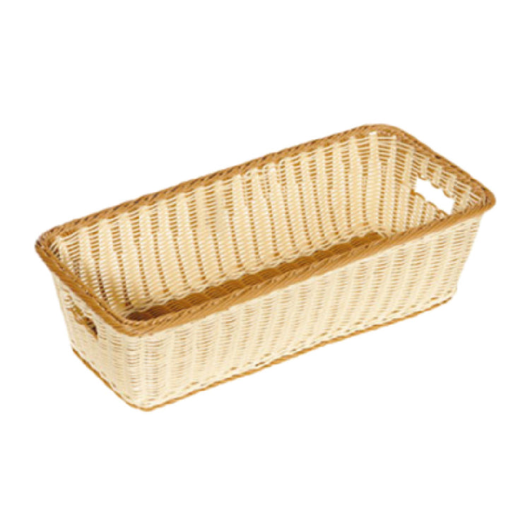 The GET Enterprises WB-1519-TT Clipper Mill Designer Polyweave Basket™ is a versatile and durable storage solution measuring 23 inches by 11 inches with a height of 6-3/4 inches. Crafted from break-resistant polypropylene, this rectangular basket is designed to withstand the rigors of daily use while maintaining its structural integrity. It features a two-tone design, adding a touch of style to its functionality. The basket is BPA-free, ensuring safety in handling a variety of items, especially in food service environments. Its dishwasher-safe attribute makes it convenient for easy cleaning and maintenance, a crucial factor for busy commercial settings. The product is packaged with six units per case, catering to businesses looking for bulk solutions. This basket is ideal for different segment markets such as hospitality, retail, and catering, where both aesthetic appeal and practical utility are valued. The GET Enterprises Polyweave Basket seamlessly combines these elements, making it a preferred choice for establishments seeking reliable and attractive storage options.