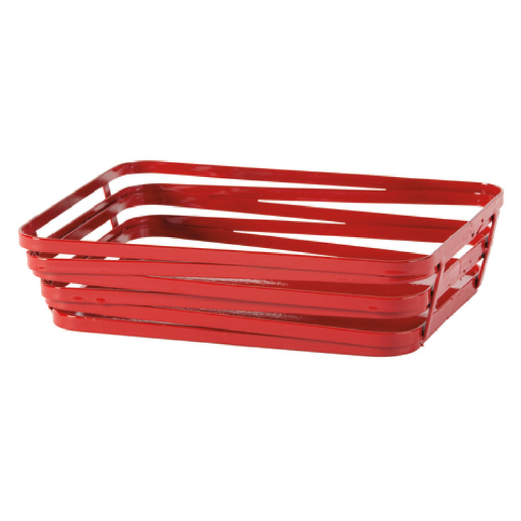 The GET Enterprises WB-982-R Cyclone™ Serving Basket is a versatile and stylish addition to any food service setting, designed with practicality and aesthetic appeal in mind. Measuring 9 inches by 7 inches by 2-1/4 inches, this rectangular serving basket is crafted from durable metal wire, ensuring long-lasting use and resilience. It features a solid bottom, which provides stability and prevents smaller items from slipping through, making it ideal for a wide range of dining environments from casual eateries to upscale restaurants. The basket is powder-coated in an eye-catching red finish, adding a pop of color that enhances table presentations and complements various decor styles. Its thoughtful design and durable materials cater to the demands of high-traffic venues, while also offering an easy-to-clean surface that supports efficient kitchen operations. Packed by 12 each per case, the GET Enterprises WB-982-R Cyclone™ Serving Basket is a practical choice for businesses looking to streamline service, enhance guest experience, and maintain a cohesive, appealing tabletop presentation. This functional yet stylish basket is perfect for serving appetizers, sides, or bread, making it an essential tool in the hospitality and food service industries.