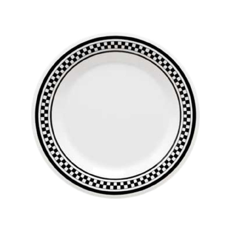 The GET Enterprises WP-10-X Diamond Chexers™ Plate is a versatile dining solution with a 10-1/2 inch diameter, perfectly suited for various culinary environments. Its round shape is complemented by a wide rim adorned with a distinctive black checkerboard pattern, adding a touch of elegance to any table setting. Crafted from durable melamine, this plate is break-resistant, ensuring longevity and reducing replacement costs for high-traffic venues such as restaurants, cafeterias, and catering services. Furthermore, it is dishwasher safe, allowing for effortless cleaning and maintenance, which is crucial in busy food service operations. It is also BPA-free, highlighting its commitment to safety and health standards. The GET Enterprises WP-10-X Diamond Chexers™ Plate is NSF certified, meeting rigorous public health and safety standards, which makes it a reliable choice for professional kitchens. Sold in packs of one dozen, it provides a practical and stylish solution for establishments looking to enhance their dining presentations with a product that marries form and function seamlessly. Its classic white backdrop with the contrasting black rim not only enhances the visual appeal of the meals served but also aligns with diverse dining themes and styles, making it an essential addition to various dining settings.