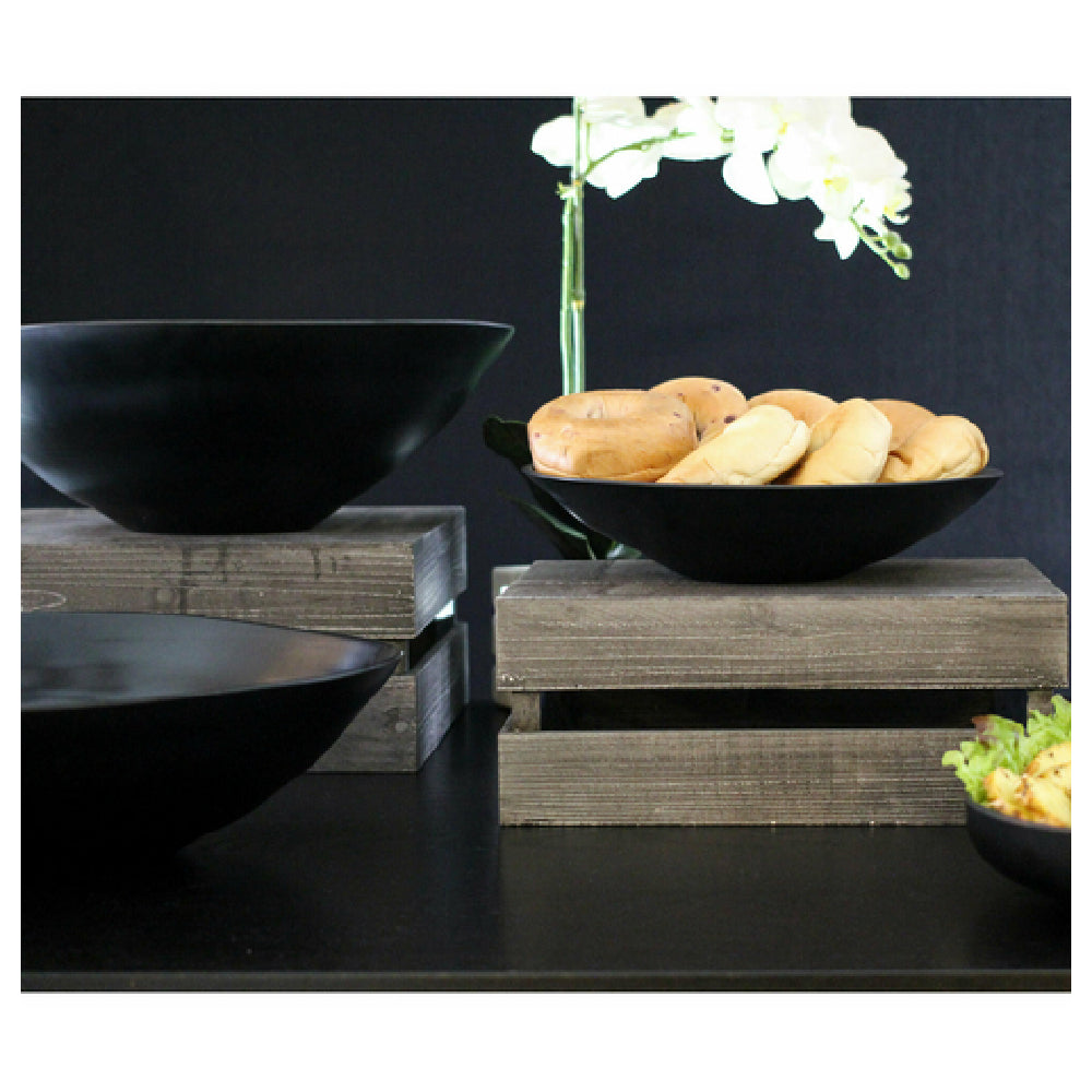 The GET Enterprises ZEA401 Cheforward Zeal Bowl is a substantial serving solution with a capacity of 130 oz., making it ideal for both commercial and large-scale culinary settings. Measuring 16 inches in length, 13 inches in width, and 5 inches in height, this oval bowl is designed to accommodate a variety of serving needs, from salads and pasta to more elaborate buffet presentations. Crafted from durable melamine, it combines the look of ceramic with a lightweight and break-resistant construction, ensuring longevity and safety in bustling environments. The bowl is BPA-free, adding an extra layer of safety for food contact, and is dishwasher safe, which facilitates easy cleaning and maintenance in busy kitchens. This product is uniquely suited for restaurants, catering services, and hospitality venues that prioritize efficiency and durability without compromising on style. The sleek black finish of the GET Enterprises ZEA401 adds a modern touch to any table setting, making it versatile enough to complement various décor themes. Each case contains four bowls, making it a practical choice for establishments needing bulk quantities. With its blend of form and function, the GET Enterprises ZEA401 Cheforward Zeal Bowl stands out as a reliable and elegant addition to any food service operation.