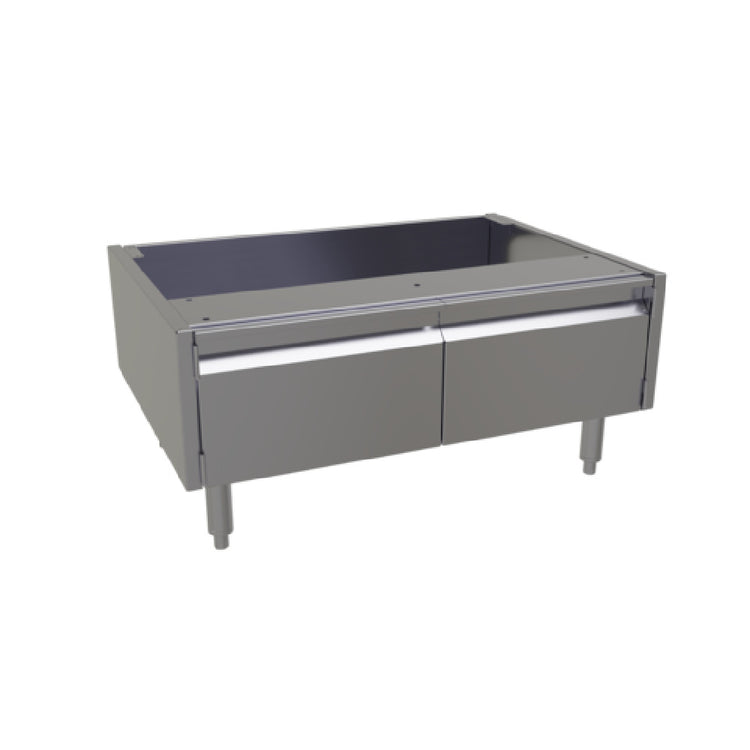 The Glastender ACB-34 Underbar Add-On Cabinet Base With Doors is an expertly crafted storage solution, measuring 34 inches in width, 24 inches in depth, and 16 inches in height, designed specifically to fit beneath underbar equipment, providing additional storage space. This cabinet base features two hinged doors equipped with integral handles, ensuring easy access and enhanced functionality. The construction highlights a removable floor with utility access, which facilitates maintenance and organization of utilities. Engineered with double-wall stainless steel construction, it promises durability and longevity in demanding environments, ideal for various market segments within the hospitality and food service industries. Furthermore, it is supported by legs with adjustable stainless steel bullet feet, allowing for stability and height customization to suit different workspace requirements. Certified by cETLus and ETL-Sanitation, this product adheres to stringent safety and sanitation standards, which is essential for maintaining compliance in professional settings. Notably, the Glastender ACB-34 is made to order, emphasizing the brand's commitment to bespoke solutions, although it's important to note that it is non-returnable. This add-on cabinet base offers a blend of practicality and efficiency, making it a valuable addition to any underbar configuration.