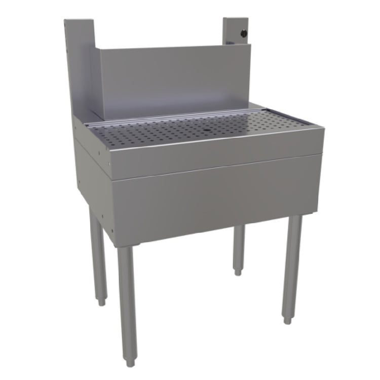 The Glastender BDA-18 Underbar Beer Drainer is expertly crafted for efficient beverage service in bars and restaurants, offering a streamlined design that measures 18 inches in width and 19 inches in depth. This underbar unit provides a practical solution with its tubing chase feature, ensuring seamless integration into any bar setup. The front drain pan is accompanied by a lift-out perforated insert, facilitating easy cleaning and maintenance. Standing with a 26-inch high work surface, this unit is designed to enhance operational workflow behind the bar. Constructed entirely from stainless steel, the drainer is built for durability and longevity, with stainless steel legs that are equipped with adjustable bullet feet for maximum stability on any surface. The Glastender BDA-18 is ETL-Sanitation certified, attesting to its compliance with stringent sanitation standards, making it a reliable choice for establishments prioritizing hygiene. Please note, this product is made to order and is non-returnable, emphasizing its customized nature tailored for specific bar environments. This specialized piece of equipment is an invaluable asset for any bar operation aiming to optimize their underbar space with a high-quality, efficient beer drainer solution.