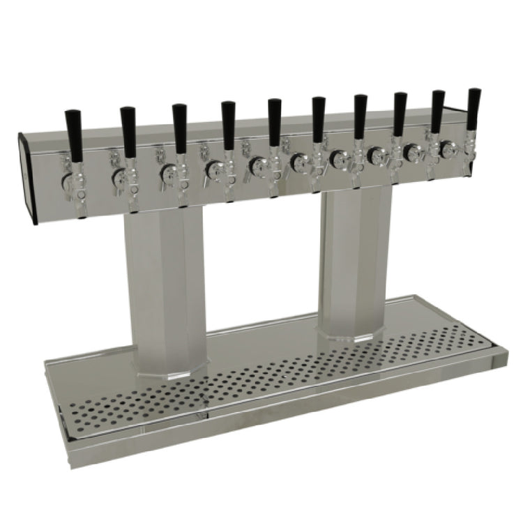 The Glastender BT-10-MF Tee Draft Dispensing Tower is a high-quality, countertop unit equipped with 10 stainless steel faucets, designed for efficient beverage dispensing in various commercial settings. This air-cooled system features two 5-inch-wide insulated columns, ensuring optimal temperature retention for the dispensed beverages. Each column is meticulously engineered with an integral drain pan, complete with a removable perforated insert for easy maintenance and enhanced sanitation. Constructed entirely from stainless steel, this dispensing tower boasts a polished chrome finish, offering both durability and a sleek, modern aesthetic. Despite its robust build, it is important to note that the faucet handles are not included, allowing users to customize the unit to their specific needs. The Glastender BT-10-MF is ETL-Sanitation certified, ensuring compliance with rigorous sanitation standards. This product is custom-made to order, emphasizing its exclusivity and tailored fit for different segments within the food and beverage industry. However, due to its bespoke nature, it is non-returnable. This dispensing tower is an ideal choice for businesses seeking a reliable and visually appealing solution to meet their high-volume beverage dispensing needs.