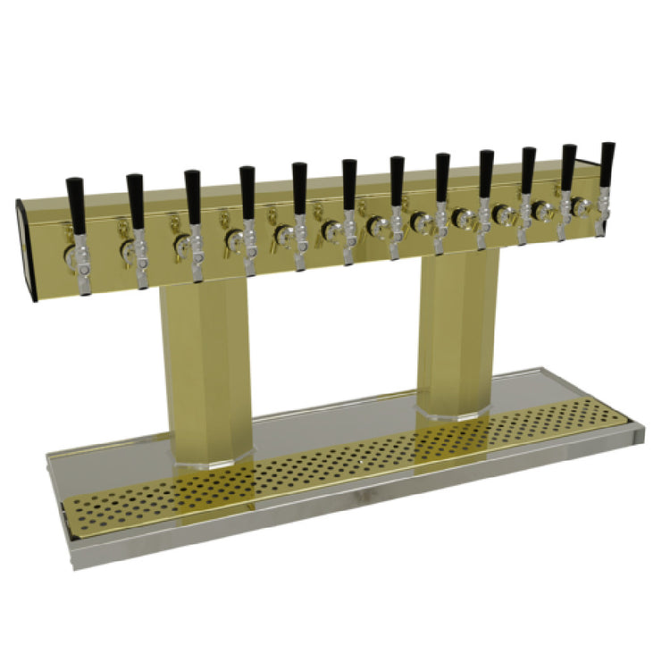 The Glastender BT-12-PB Tee Draft Dispensing Tower Countertop is a premium draft dispensing solution featuring 12 stainless steel faucets, specifically designed for high-demand environments in the beverage industry. This unit is air-cooled, enhancing the efficiency and reliability of beverage dispensing. The dual 5-inch wide insulated columns ensure optimal temperature maintenance, crucial for preserving the quality of the draft beverages. Its all-stainless steel construction not only offers durability but also a sleek, professional appearance, complemented by a polished brass finish that adds a touch of elegance. The integral drain pan, featuring a mirror finish, is equipped with a brass finish removable perforated insert, simplifying cleaning and maintenance processes. It is important to note that the handles are not included, allowing customization to suit specific branding or aesthetic preferences. With its ETL-Sanitation certification, the Glastender BT-12-PB meets stringent health and safety standards, making it an ideal choice for bars, restaurants, and breweries that prioritize quality and compliance. This product is made to order and is non-returnable, emphasizing its bespoke manufacturing process tailored to customer specifications.