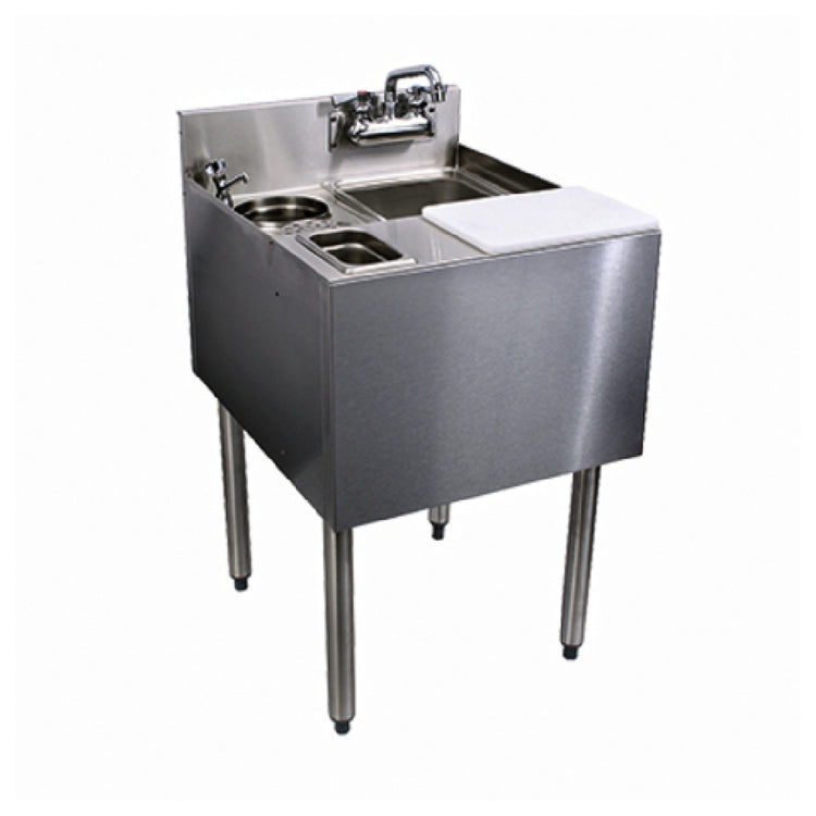 The Glastender C-MFT-20 CHOICE Underbar Mixology Unit is a versatile and compact solution for mixologists and bars looking to optimize their workspace. Measuring 20 inches in width and 24 inches in depth overall, this free-standing unit features a meticulously designed 9-1/4-inch wide by 11-1/2-inch front-to-back by 6-inch deep bowl, perfect for efficient cocktail preparation. It includes a splash-mounted faucet and a lift-out plastic perforated sink strainer, ensuring easy cleaning and maintenance. A push-down rinser faucet is integrated for convenient glass rinsing. The 6-inch diameter tool well with its own dedicated faucet is a unique feature, enhancing the unit's functionality for bartenders. Additionally, the unit comes with an 11-inch wide by 8-inch deep removable cutting board and a removable scoop well, providing flexibility and ease of use. Constructed with durable stainless steel, the unit is supported by stainless steel legs with adjustable thermoplastic bullet feet for stability on uneven surfaces. It is low lead compliant and ETL-Sanitation certified, making it a reliable and safe choice for any bar or restaurant setting. The Glastender C-MFT-20 is an essential addition for businesses seeking efficient and organized beverage service operations.