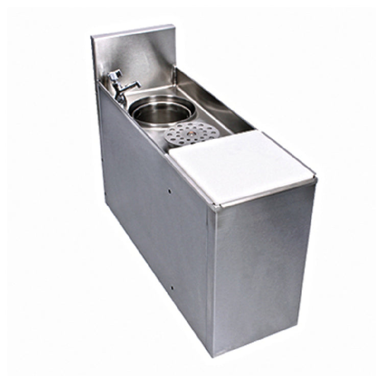 The Glastender C-MFT-8 CHOICE Underbar Mixology Unit is a compact and efficient solution for professional bar environments, measuring 8”W x 24"D O.A. This unit features a 6” diameter tool well equipped with a push-down rinser faucet, ensuring easy and effective cleaning of mixology tools. The inclusion of a 7-1/2” x 7-1/2” removable cutting board offers versatility and convenience for bartenders managing a variety of tasks. Constructed from stainless steel, the unit promises durability and resistance to wear, while its low lead compliance supports safety and environmental standards. Notably, the unit is designed to mount to an adjacent piece of underbar equipment, eliminating the need for legs and offering seamless integration into existing setups. With ETL-Sanitation certification, the Glastender C-MFT-8 meets rigorous sanitation standards, making it an ideal choice for bars prioritizing cleanliness and compliance. This product is made to order, reflecting its tailored application for specific professional needs, and is non-returnable, highlighting its customized nature. The Glastender C-MFT-8 is a strategic asset for those in the hospitality industry looking to enhance efficiency and maintain high standards of hygiene in their beverage service area.