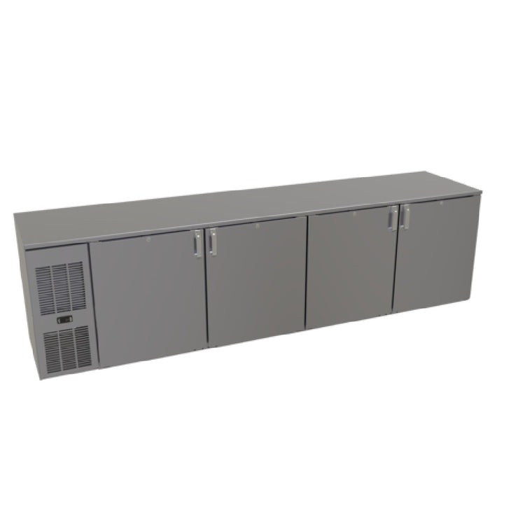 The Glastender C1FL108 Cooler is a versatile and efficient refrigeration unit designed for diverse commercial environments. This low-profile cooler measures 108 inches in width and features a four-section design, promoting extensive storage capacity. The unit is front serviced, ensuring easy accessibility for maintenance and operation. It boasts a 20-inch wide door opening, providing convenient access to stored items. Utilizing self-contained refrigeration and front venting, it maintains optimal cooling performance while saving space. The cooler is equipped with LED interior lighting, enhancing visibility and reducing energy consumption. Both the interior and exterior sub-top are constructed from durable stainless steel, ensuring longevity and ease of cleaning. Each door includes two adjustable shelves, allowing for flexible storage arrangements. The C1FL108 uses R290 Hydrocarbon refrigerant, a sustainable option with a low environmental impact. With a 1/4 horsepower motor, the cooler delivers reliable performance. It complies with NSF Standard 7 for open food storage, ensuring safety and hygiene. The unit holds certifications from cETLus, ETL-Sanitation, and ETL Verified, attesting to its quality and adherence to industry standards. Please note, this cooler is made to order and non-returnable, making it a tailored solution for specific cooling needs in the food service industry.