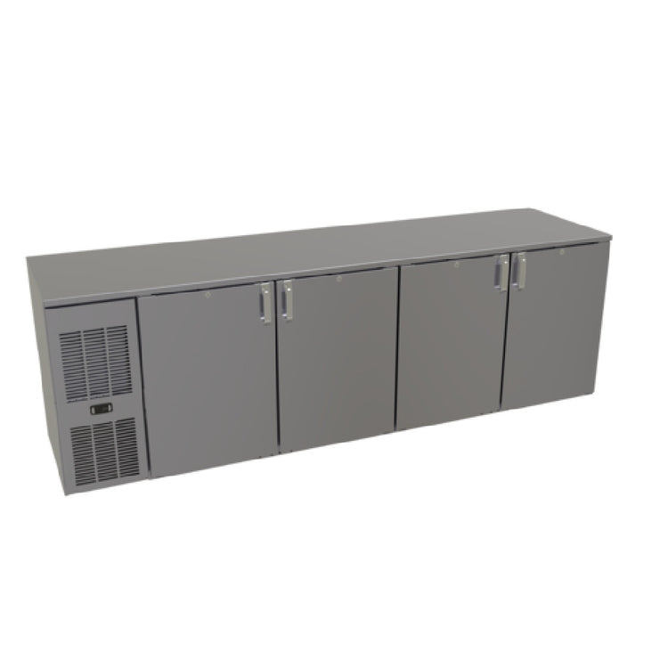 The Glastender C1FL92 Cooler is a meticulously engineered, one-zone, front-serviced refrigeration unit designed for efficiency and versatility in commercial settings. It features a low profile, measuring 92 inches in width, with a four-section configuration and each door offering a 16-inch opening for easy access. This cooler is equipped with a self-contained refrigeration system, ensuring optimal cooling performance with minimal maintenance. The LED interior lighting enhances visibility, facilitating quick product identification. Front venting optimizes space utilization, making it suitable for tight kitchen areas. The cooler's construction boasts a stainless steel interior and exterior sub-top, providing durability and ease of cleaning. Each door comes with two adjustable shelves, allowing for customizable storage solutions. Utilizing R290 Hydrocarbon refrigerant, it supports eco-friendly refrigeration practices. With a 1/4 HP compressor, it efficiently maintains desired temperatures. Certified to NSF Standard 7, the Glastender C1FL92 is compliant for open food storage, ensuring safety and quality for food service operations. It holds certifications from cETLus, ETL-Sanitation, and ETL Verified, reflecting its adherence to rigorous industry standards. Notably, this cooler is made to order and non-returnable, offering a specialized solution tailored to specific commercial refrigeration needs.