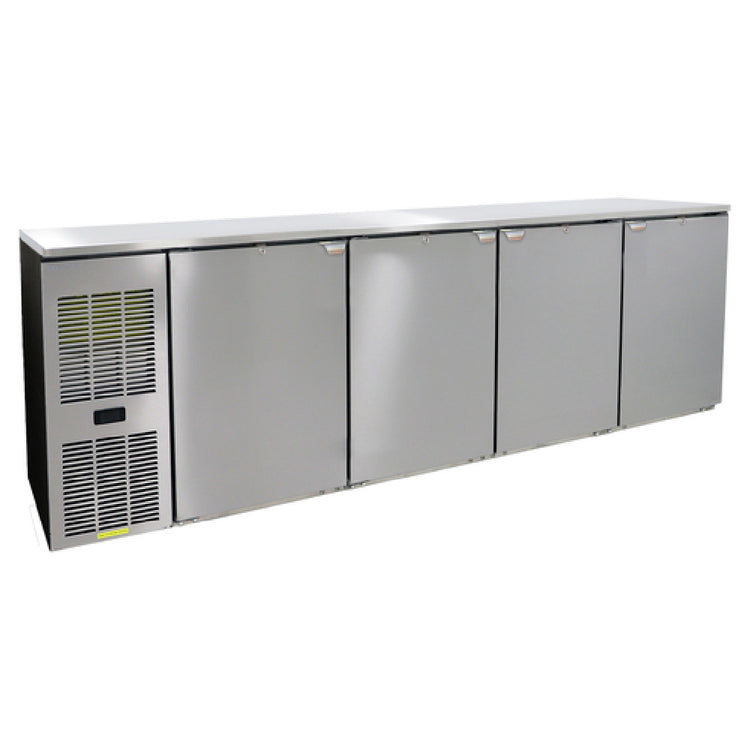 The Glastender C1FL92-UC Cooler - a one-zone, front-serviced undercounter refrigeration unit spanning 92 inches - is designed to meet the rigorous demands of commercial kitchens. This four-section cooler accommodates a substantial 19.8 cubic feet of interior capacity, with each of its 16-inch wide door openings leading to a stainless steel interior. Equipped with LED interior lighting and front venting, it ensures optimal visibility and efficiency. The stainless steel finished top and interior not only provide durability but also a sleek, professional appearance. Each door features two adjustable shelves, allowing for customizable storage solutions, while the stainless pull tab handles with locks enhance security and ease of access. Powered by a 1/4 HP self-contained refrigeration system, it utilizes R290 Hydrocarbon refrigerant, aligning with eco-friendly standards. Certified by NSF Standard 7 for open food storage and ETL sanitation, it guarantees adherence to top public health and safety requirements. Additionally, its cETLus and ETL Verified certifications confirm its compliance with North American safety standards. Made to order with precision, this cooler is a reliable choice for restaurants, bars, and catering services seeking robust and efficient refrigeration solutions tailored to their specific needs. Note: This product is non-returnable.