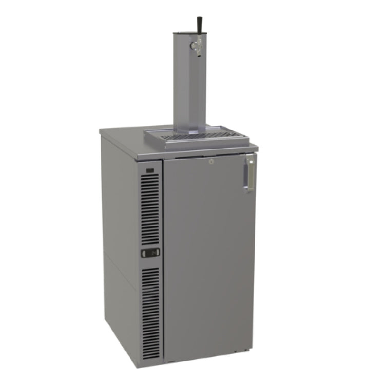 The Glastender C1SB20-CD Cold Brew Coffee Dispensing Cooler is a meticulously engineered, one-zone, side-serviced unit designed for the efficient dispensation of cold brew coffee. With a compact bar profile of 20 inches in width and a door opening of 12 inches, this cooler is an excellent choice for establishments with space constraints. It features a self-contained refrigeration system that efficiently maintains the optimal temperature for cold brew coffee, utilizing the environmentally friendly R290 Hydrocarbon refrigerant and operating at a power of 1/8 HP. The interior is illuminated by bright white LED lighting, enhancing visibility and presentation, while the stainless steel interior, complete with a keg rack, ensures durability and easy cleaning. The front venting design contributes to its seamless integration with existing bar setups. This unit is also equipped with a 1-inch stainless steel finished top and a galvanized steel back, reinforcing its sturdy construction. Certified under NSF Standard 7 for open food storage, along with cETLus, ETL-Sanitation, and ETL Verified certifications, the Glastender C1SB20-CD guarantees compliance with safety and sanitation standards. Custom-made to order, this product underscores Glastender's commitment to providing tailored solutions for the hospitality industry's dynamic needs.