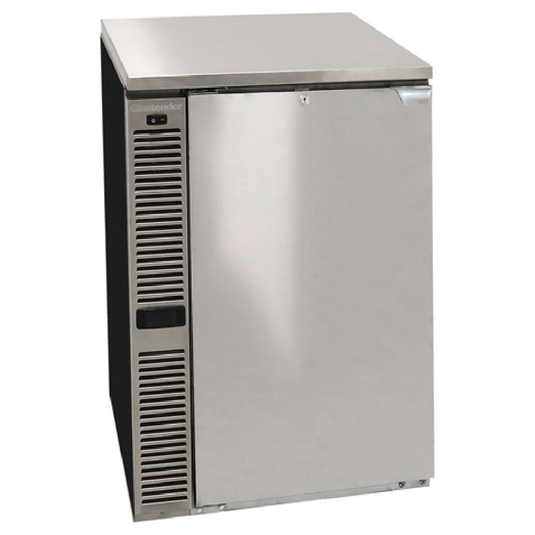 Glastender C1SL24-UC Cooler - one zone, side serviced, undercounter unit measuring 24"W, is specifically engineered for efficient refrigeration in compact spaces. It features a 17.5"W door opening and boasts a substantial 4.77 cu. ft. interior capacity, making it suitable for a variety of refrigeration needs within food service environments. The cooler incorporates self-contained refrigeration with eco-friendly R290 Hydrocarbon refrigerant, powered by a 1/8 HP compressor, ensuring efficient cooling and energy-saving operation. The cooler's front venting is designed for optimal placement under counters, while its LED interior lighting offers enhanced visibility of stored items. The interior is constructed from stainless steel, enhancing durability and ease of cleaning, complemented by a stainless steel finished top that provides additional workspace. It includes two adjustable shelves per door, providing flexibility for varying storage requirements. A stainless pull tab handle with lock enhances security, making it suitable for environments where access control is necessary. The Glastender C1SL24-UC Cooler meets NSF Standard 7 for open food storage and holds certifications from cETLus, ETL-Sanitation, and ETL Verified, ensuring quality and safety in commercial settings. Please note: this item is made to order and is not returnable, ensuring a tailored fit for specific refrigeration needs.