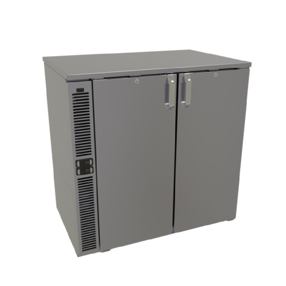 The Glastender C2SB36 Cooler Two Zone Side Serviced is a versatile refrigeration unit designed for optimal functionality in bar settings. With a compact 36-inch width, this two-section cooler features a 12-inch wide door opening, allowing easy access to stored items. Its self-contained refrigeration system utilizes R290 Hydrocarbon refrigerant, which is eco-friendly and energy-efficient. The cooler's stainless steel interior ensures durability and ease of cleaning, while LED interior lighting enhances visibility, making it easier to locate items. Front venting technology aids in efficient heat dissipation, which is crucial for maintaining consistent internal temperatures. The cooler operates with a 1/8 HP motor, providing adequate power for its size and purpose. Certified to NSF Standard 7 for closed container products, and carrying both cETLus and ETL-Sanitation certifications, it meets rigorous public health and safety standards. Notably, this product is customized upon order and is non-returnable. The Glastender C2SB36 is ideal for establishments seeking reliable, space-efficient refrigeration solutions, providing precise cooling and a streamlined design that fits seamlessly into various commercial environments.