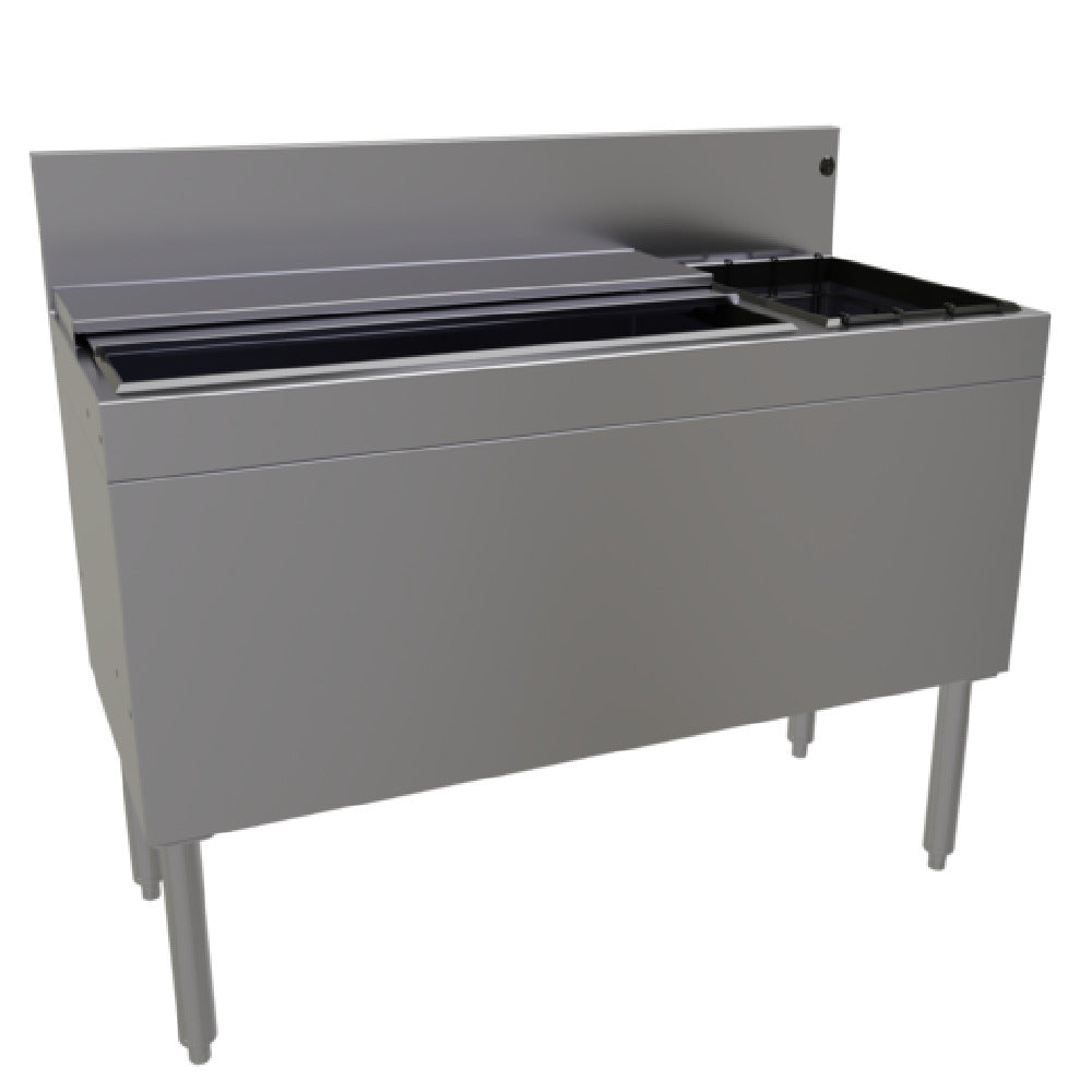 The Glastender CBA-42R-CP10-ED Extra Deep Underbar Ice Bin/Cocktail Unit with Bottle Well Storage is meticulously crafted to meet the demanding needs of bars and restaurants requiring efficient space utilization and robust performance. This unit features a 42-inch width and a 19-inch depth, offering ample room for your ice storage needs. Its extra-deep design includes a 14-1/2-inch deep bin liner, capable of holding up to 116 pounds of ice, making it suitable for high-volume service environments. A built-in 10-circuit cold plate ensures optimal temperature management for ice preservation. The unit also boasts a 6-bottle insulated storage compartment on the right, maximizing organization and accessibility. Stainless steel construction throughout, including stainless steel sliding covers and legs with adjustable bullet feet, promises durability and easy maintenance. The ABS plastic breaker strip around the ice bin liner provides an added measure of protection and longevity. ETL-Sanitation certified, this product is made to order and non-returnable, ensuring it is tailored to meet specific operational needs. The thoughtful integration of features such as the cold plate and bottle well storage positions the Glastender CBA-42R-CP10-ED as a versatile and reliable choice for enhancing the efficiency and workflow of professional bar settings.