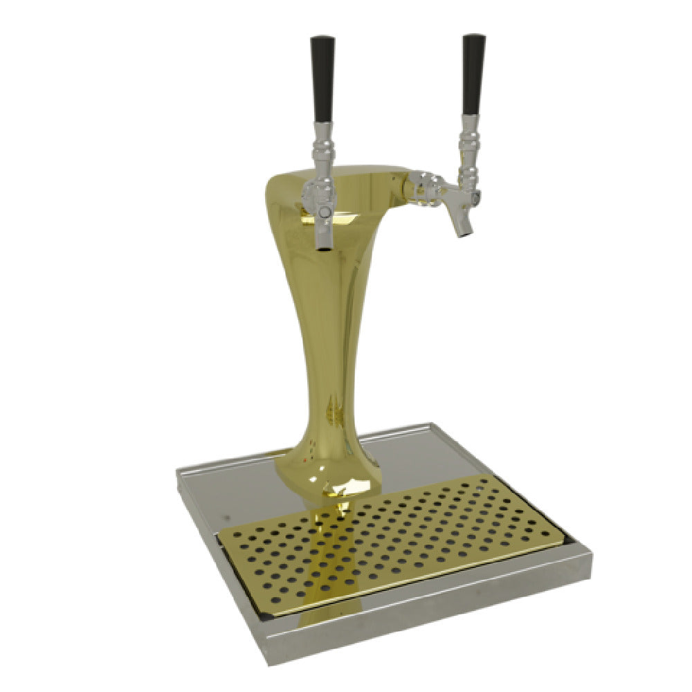 The Glastender CBT-2-GF Cobra Draft Dispensing Tower is a meticulously engineered countertop unit that features dual stainless steel faucets, designed specifically for dispensing draft beverages with precision and style. Notably, the unit does not come with faucet handles, allowing users to select their preferred handles to suit their aesthetic or functional needs. This air-cooled tower boasts a stunning mirror finish, complemented by an integral drain pan that includes a removable gold finish insert, enhancing both its visual appeal and functionality. Its all stainless steel construction ensures durability and longevity, making it a reliable choice for various settings such as bars, restaurants, and breweries. The gold finish adds a touch of elegance, making the Glastender CBT-2-GF a standout piece in any beverage dispensing setup. Please note this product is made to order and is not returnable, highlighting its customization aspect to meet specific requirements. This draft dispensing tower is ideal for market segments that value both form and function, such as upscale dining establishments and high-end event venues, where both performance and aesthetic appeal are paramount.