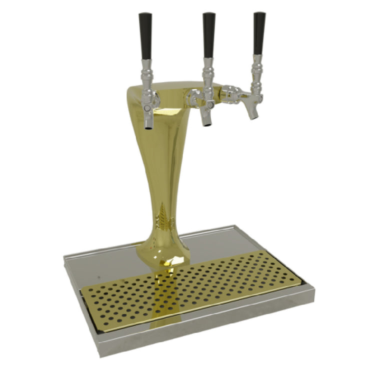 The Glastender CBT-3-GF Cobra Draft Dispensing Tower is a sophisticated countertop unit designed for efficient beverage dispensing, featuring three stainless steel faucets. This tower is air-cooled, ensuring optimal temperature maintenance for a variety of beverages. A standout feature is its mirror finish integral drain pan, which includes a removable gold finish insert that adds a touch of elegance to its all-stainless steel construction. The gold finish not only enhances its aesthetic appeal but also complements high-end bar settings. While handles are not included, the Glastender CBT-3-GF is made to order, emphasizing its bespoke nature and catering to customized needs. The non-returnable aspect highlights its tailor-made production, ensuring it meets specific customer requirements. Its durable stainless steel build ensures longevity and reliability, making it suitable for high-traffic commercial environments such as bars, pubs, and restaurants. The Glastender CBT-3-GF Cobra Draft Dispensing Tower combines robust construction with sleek design, offering a premium solution for establishments seeking to elevate their beverage service. This product is particularly advantageous for venues aiming to create a visually appealing and efficient beverage dispensing system, aligning with industry standards for quality and performance.